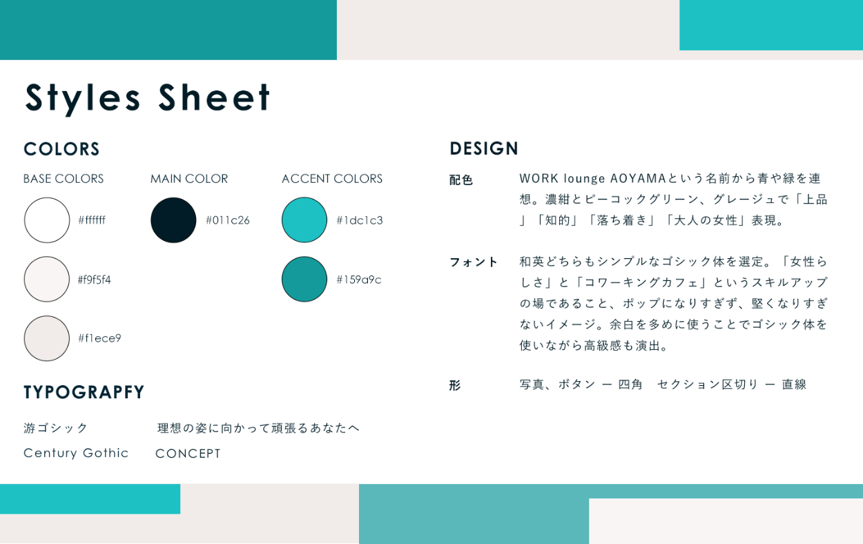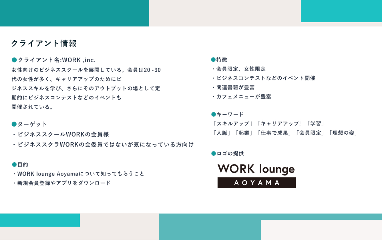 Work lounge AOYAMAがどんなコワーキングスペースなのか一目でわかるよう、実際にPCで仕事をしている女性が写っている写真を選択しました。また、要件書とペルソナ、クライアント情報より3つの特徴を選び他のコワーキングスペースとの差別化を図りました。