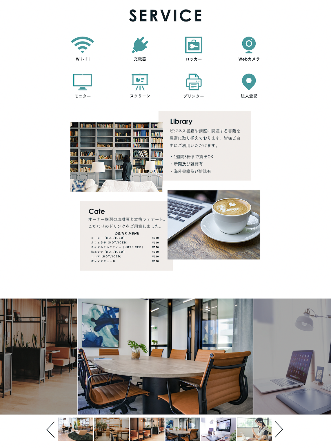 【サービス】 コワーキングスペースを利用するために調べる項目は「どんな設備があるのか」「どんなスペースがあるのか」の2点と予想しました。そのためアイコンや写真を中心に見るだけでおおまかに認識できるようデザインしました。