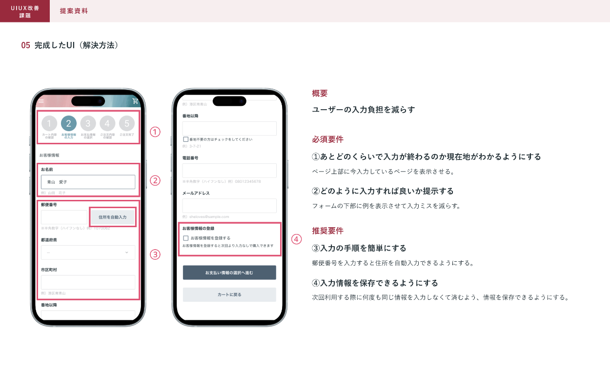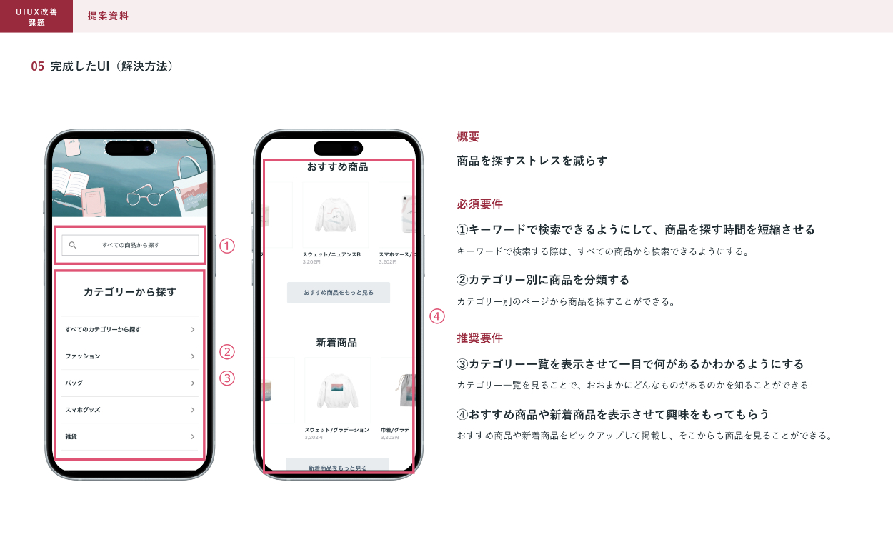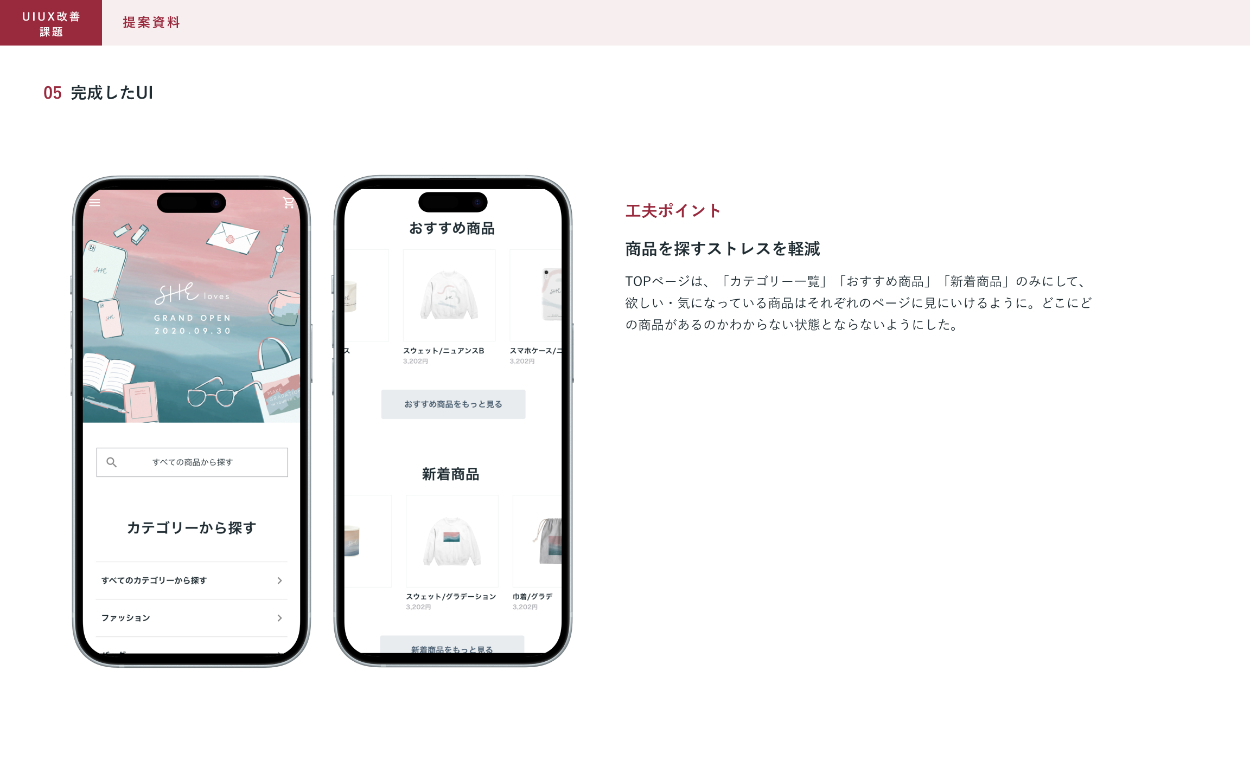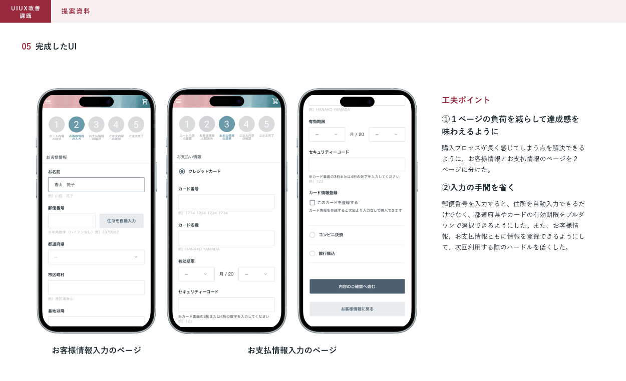 UI/UX改善を行うのは初めてだったため、課題解決からUI作成まで一貫して学ぶことができました。また、普段何気なく利用しているECサイトですが、UI/UXの観点で注目してみると、売上に繋がるような工夫やユーザーがストレスなく楽しめるような工夫など、さまざまな工夫をされていることを知りました。