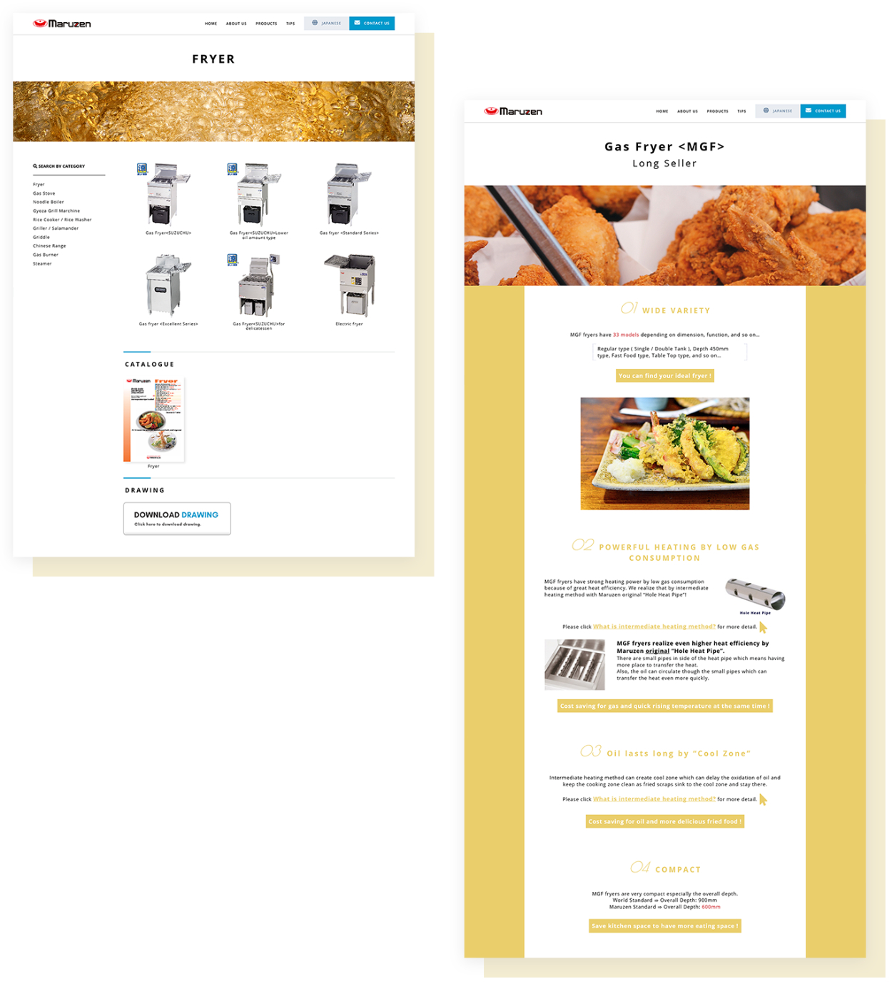 業務用厨房機器メーカー株式会社マルゼンの海外向けサイトの製品情報ページのデザイン。新卒で入社した会社でで、最も力を入れて作成していたWebサイトです。 担当:[デザイン/コーディング]