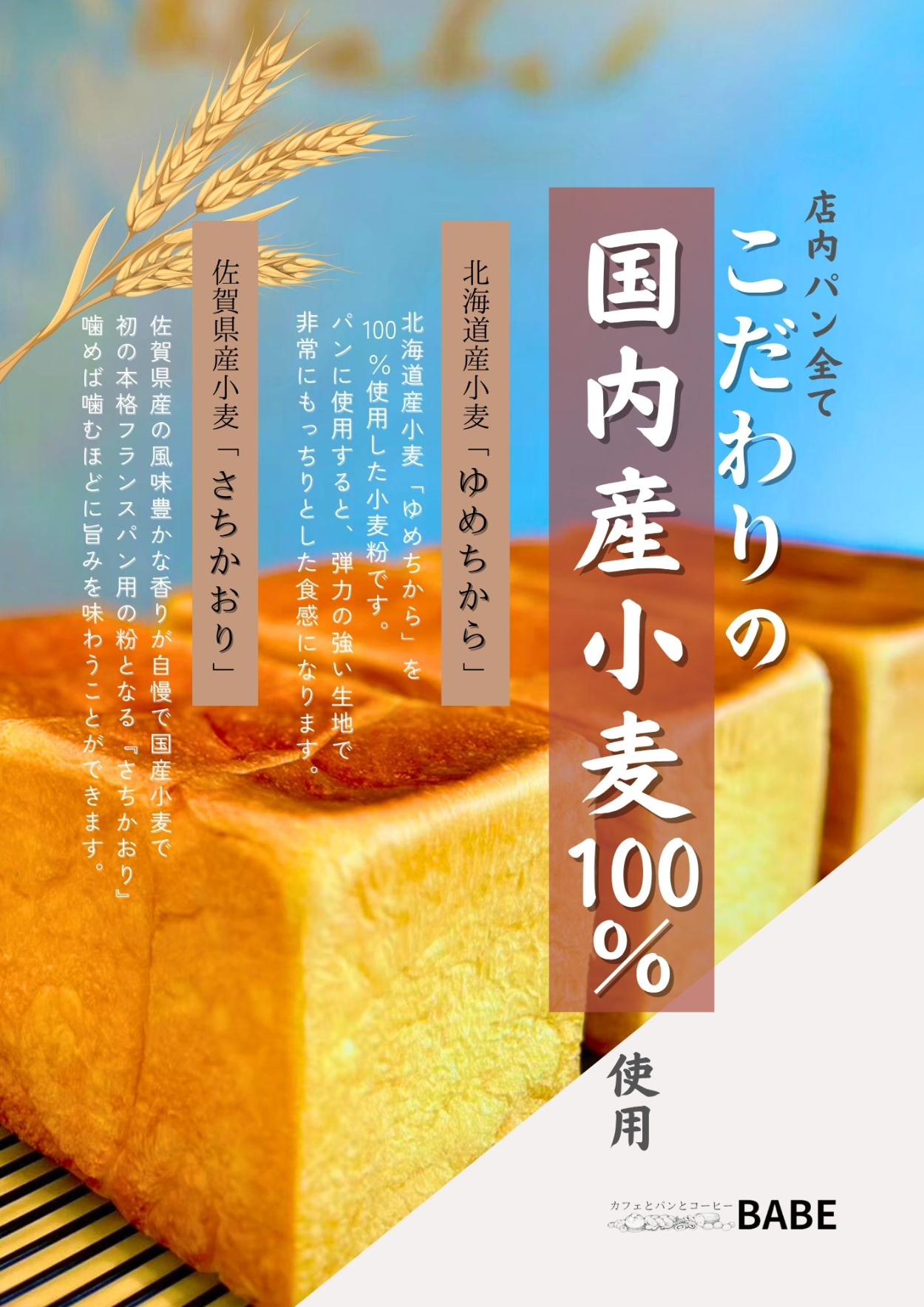 店内のパンが全て国産小麦100%で、北海道産「ゆめちから」と佐賀県産「さちかおり」2種類を使用しているということが一目で分かるように。