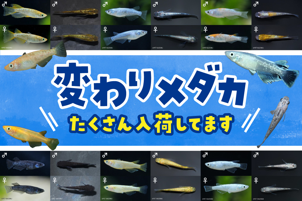 ④変わりメダカ入荷のお知らせバナーは、メダカの模様や色味の変わり具合を全面的に載せたかったため、変化のわかる画像を配置し、メダカコレクターの方に関心を持って頂けるバナーを作成しました。