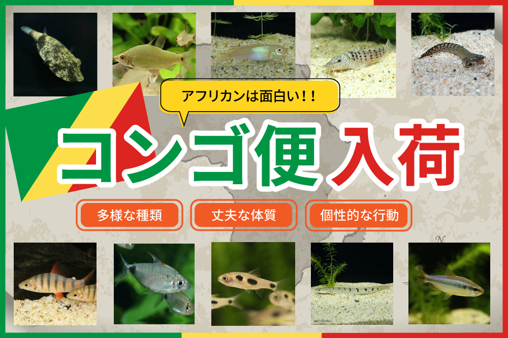 ①コンゴから入荷した個体の入荷お知らせのバナーでしたので、コンゴの国旗カラー、そしてアフリカンをイメージさせるカラー、地図を背景に使用し、個体コレクターの方が関心を抱くよう、個体を並べて配置しました。