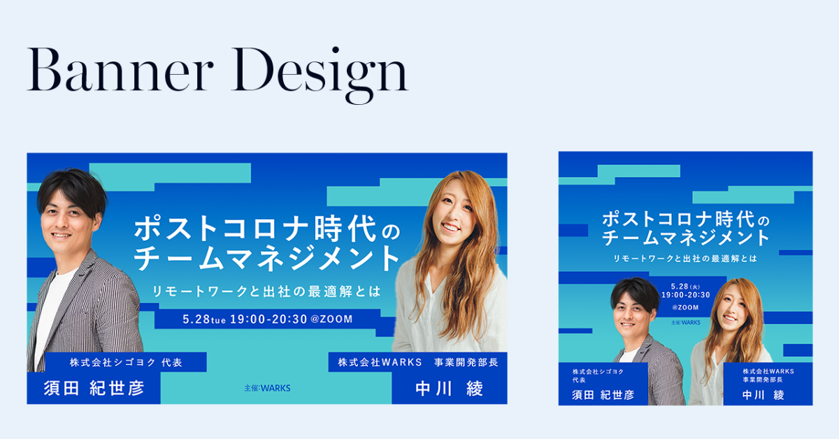 - 告知と集客メインのバナーである点を考慮し、セミナーの内容と開催日程が一目でわかるよう、タイトルと日時を大きく、中央に配置しました。