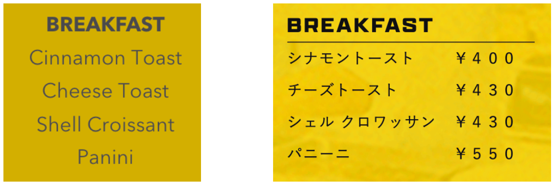 文章の提案も依頼されていた為、カフェの魅力がより伝わるよう、文章を改善しました。MENUの表記もターゲットに合わせて英語から日本語へ変更。値段も表記して来店前の予算ネック解消に繋がるようにしました。