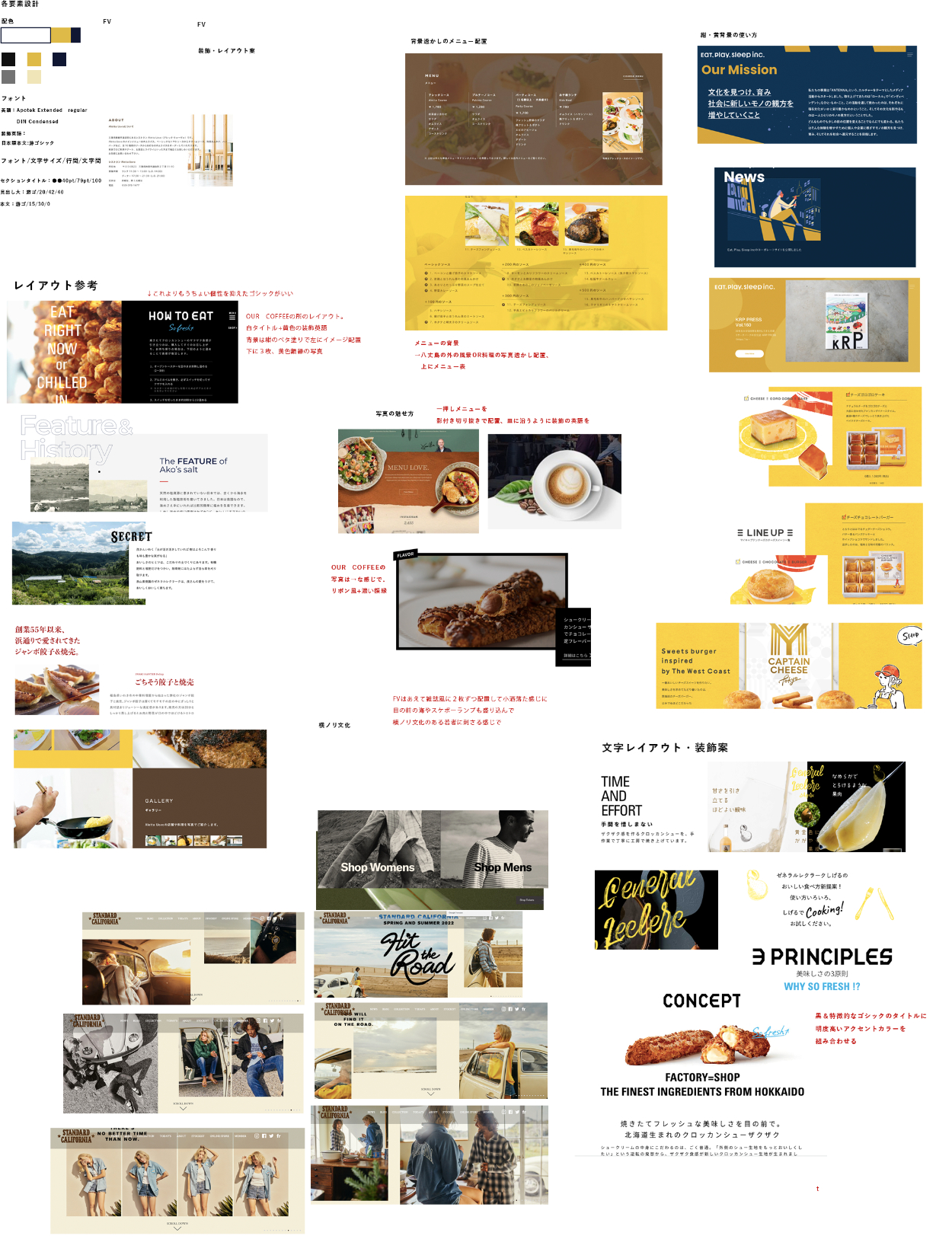 続いてリサーチに移ります。コンセプトに当てはまりそうな参考デザインを、レイアウト・フォント・装飾・写真など要素ごとに集めていきました。