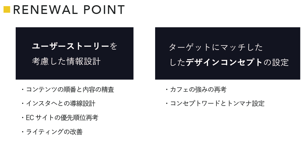 現状のサイトは構成面・デザイン面共に不満が多く、よりカフェの魅力が伝わるようにしたい。ECサイトやinstagramとの導線設計を特に意識したい。