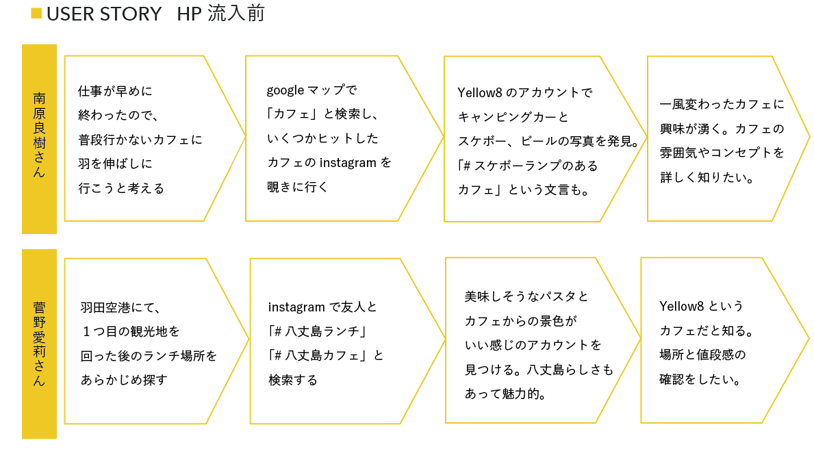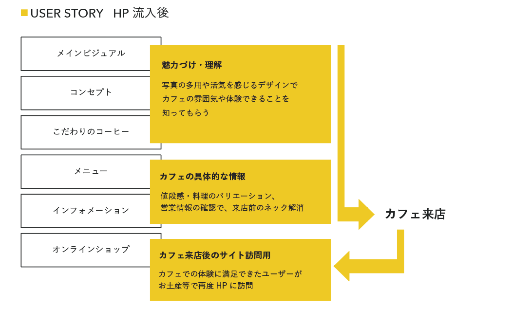 クライアントはECサイトの売上UPを特に意識されていました。しかし、オープンしてまだ1年の当カフェは、まずは認知拡大と来店促進が優先順位が高いのではとお伝えし、下記の2点を軸として進めることを提案しました。instagram戦略も、ペルソナが辿るユーザーストーリーを考慮した上で設計することを提案しました。