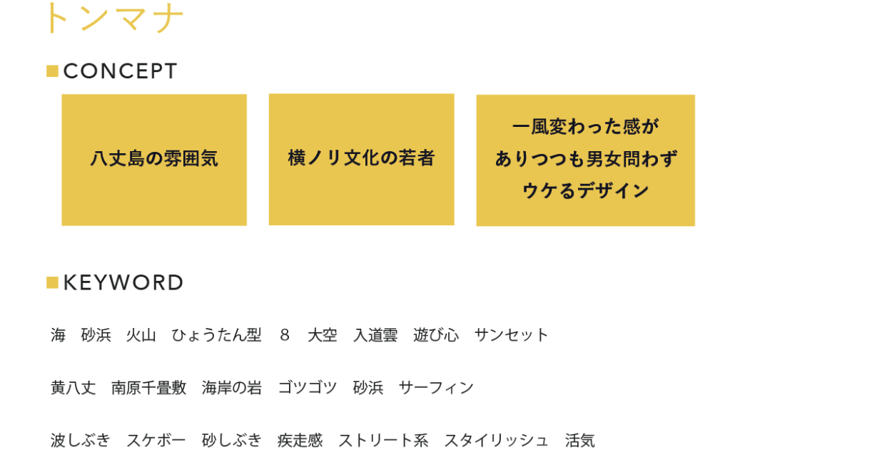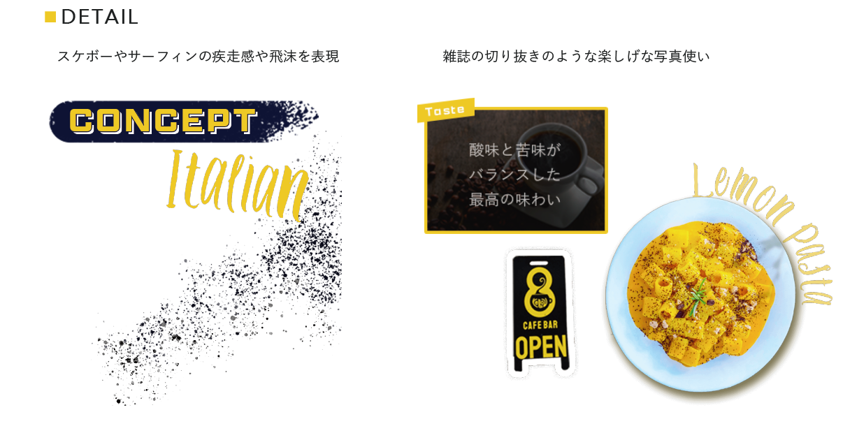 コンセプトに沿って各要素のアウトプットを行いました。各セクションのタイトルデザインは特にこだわっており、横ノリ文化の奇抜なボードデザインと波・砂しぶきを掛け合わせています。