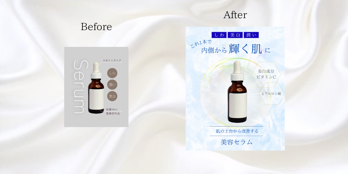 Beforeのバナーは、この美容液を使用した人がどんな効果を得られるのか、どんな状態になれるのかがわかりにくいデザインになっていました。