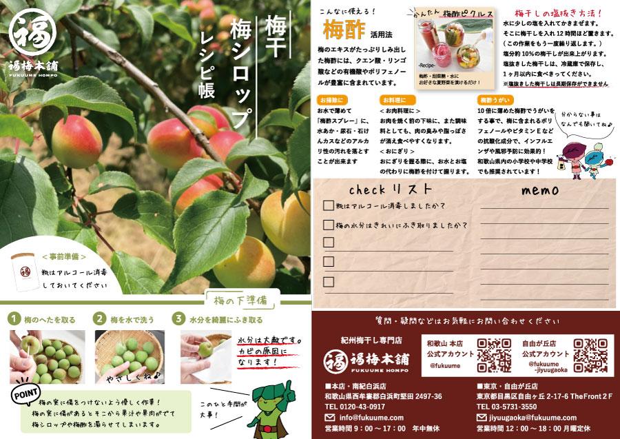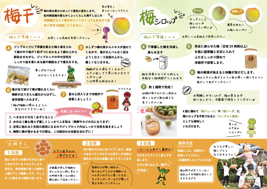 梅キットへ同梱するレシピ帳 mikochi9162 イラストレーター、webデザイナー OVERVIEW 梅干しや梅ジュースを販売する際に、商品と一緒にレシピ帳を同梱して送りました。 YEAR 2021 子供も一緒に作れるように、子供でも分かりやすく、読みこませない、視覚で伝わるように心がけて作成しました。挿絵のキャラクターも梅干しのイラストも作成しました。
