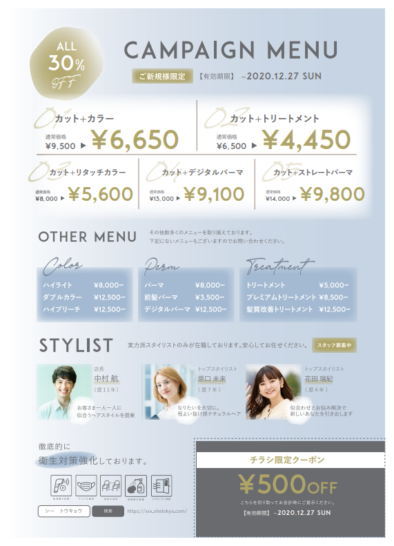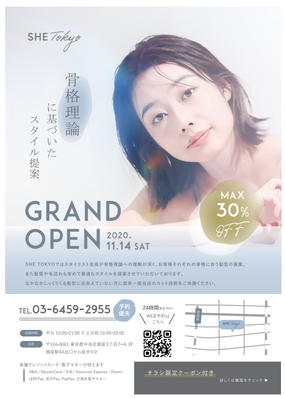 SHElikes MULTI CREATOR PROJECTの課題で、骨格理論に基いたスタイル提案が売りの美容室の特別キャンペーンフライヤー制作に取組みました。制作時間:15時間)