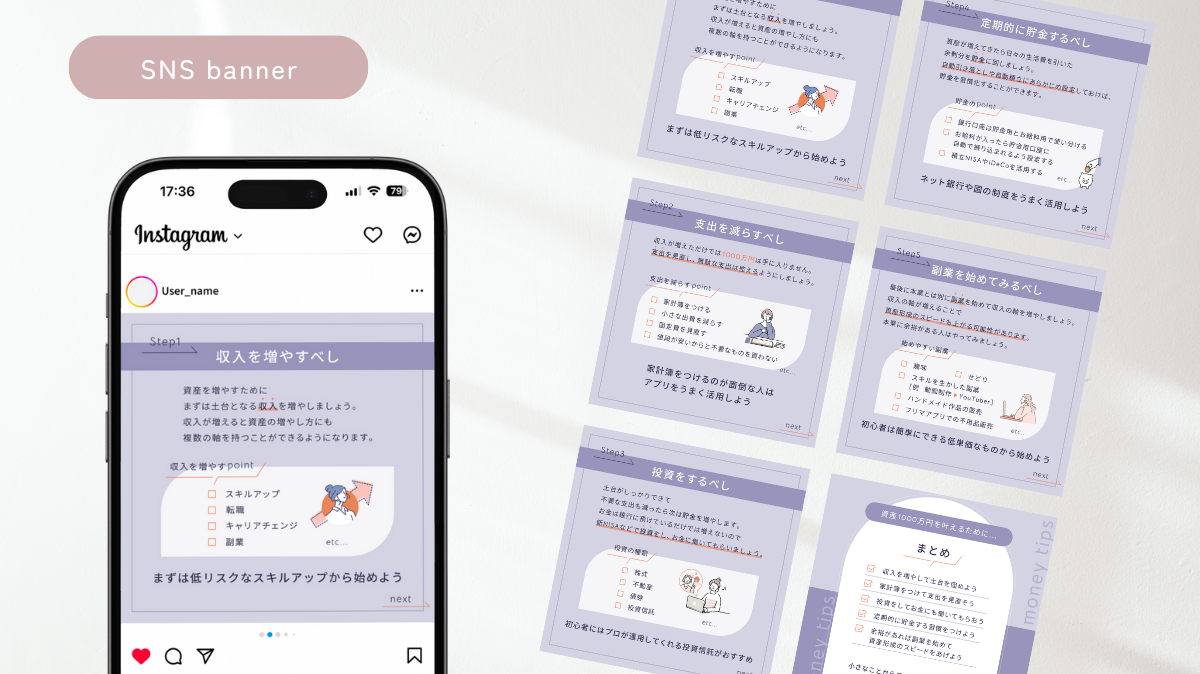 SHE株式会社(SHEmoney)様のSNSクリエイティブコンペに提出するバナーを制作いたしました。企画書を基にデザインのみを担当いたしました。[制作期間:3日間/制作時間:8時間/使用ツール:Photoshop]