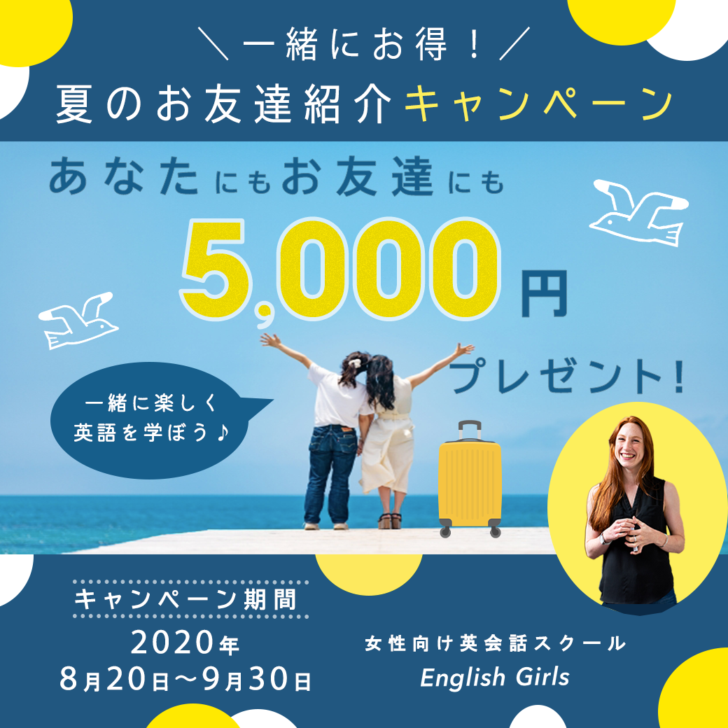<文言>①夏のお友達紹介キャンペーン ②あなたにもお友達にも5,000円プレゼント ③期間:2020年8月20日~9月30日 ④一緒にお得!