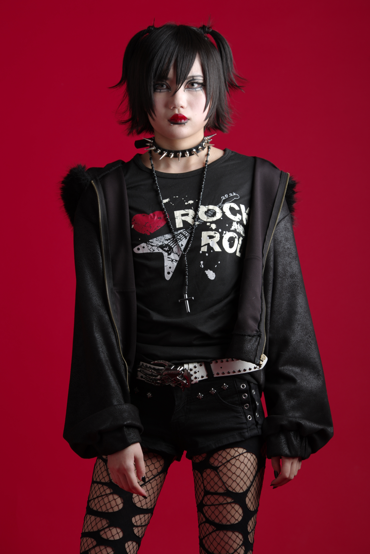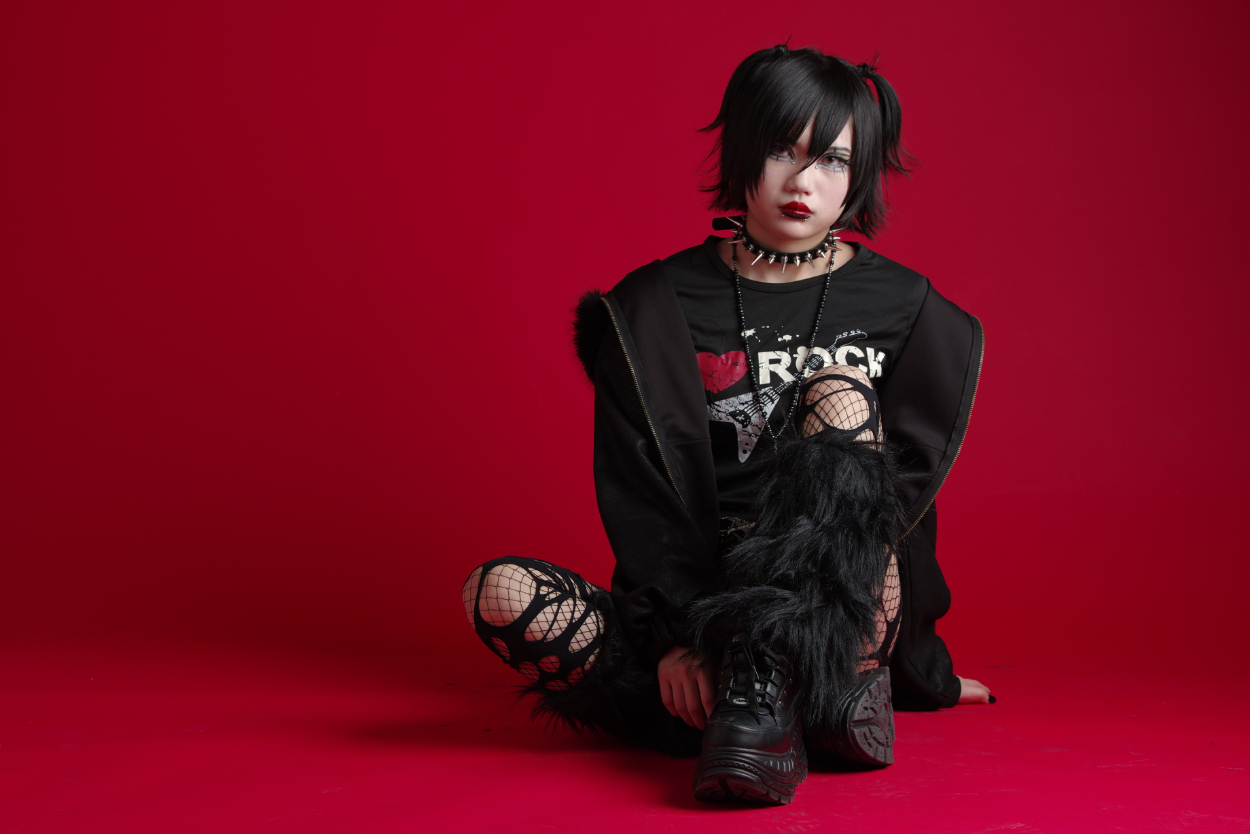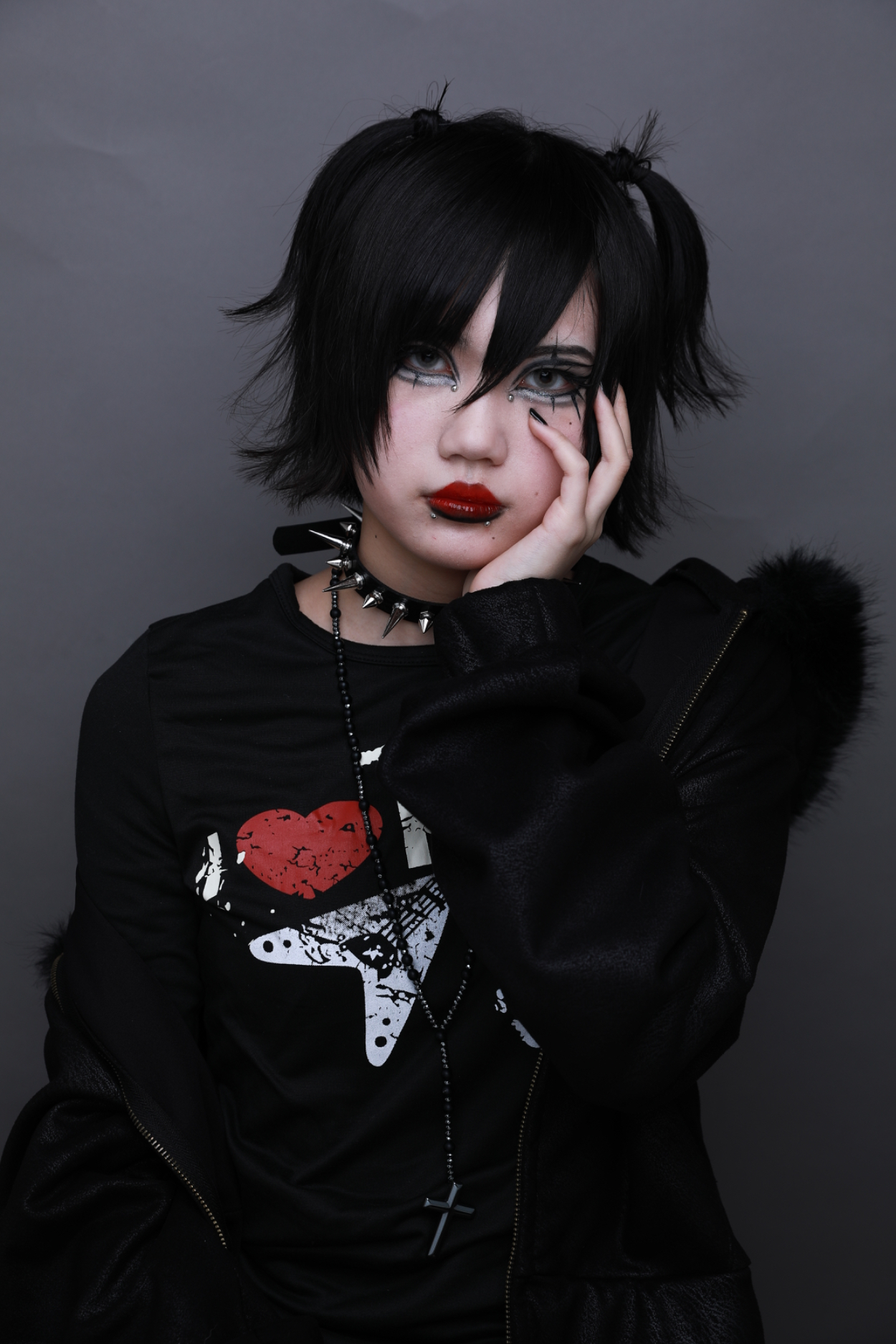 ロックメイク イイダ 専門学生 ロックメイクをしました。全体的に黒を基調にコントラストを意識し、力強い印象に仕上げました。1970年代のパンクカルチャーをリスペクトし、にじみや質感もデザインの一部として活かし、荒さの中に統一感が生まれるよう工夫しました。