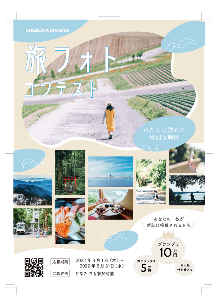 月刊SHEBOOKS(架空の雑誌)で「旅フォトコンテスト」を実施するため、コンテストの参加者を募りたい → 自分らしい旅を楽しむことをテーマにした特集に、旅フォトコンテストでのグランプリ受賞写真を掲載する予定