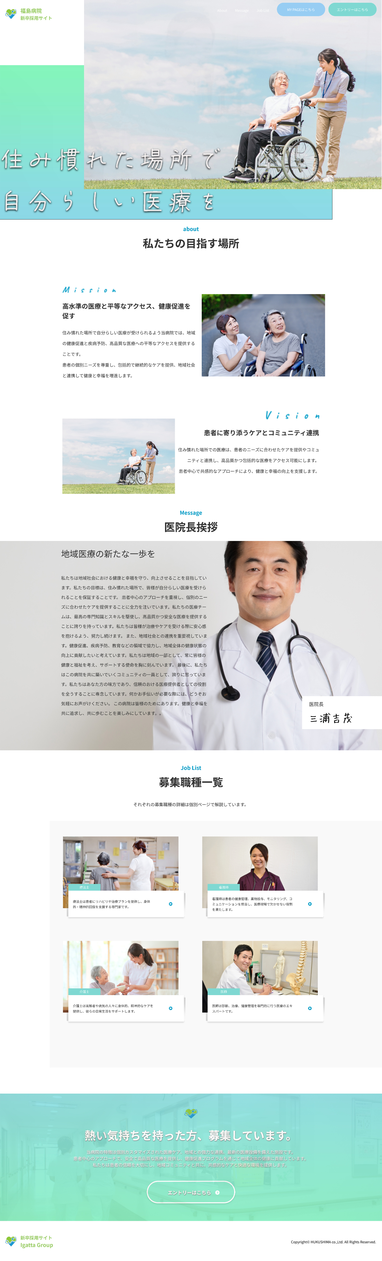 「病院の新卒採用サイト」という架空サービスをイメージし、親しみやすさと清潔感をイメージさせる為青や緑の色を使用し「住み慣れた場所で、自分らしい医療を受ける」というイメージを表現しました。