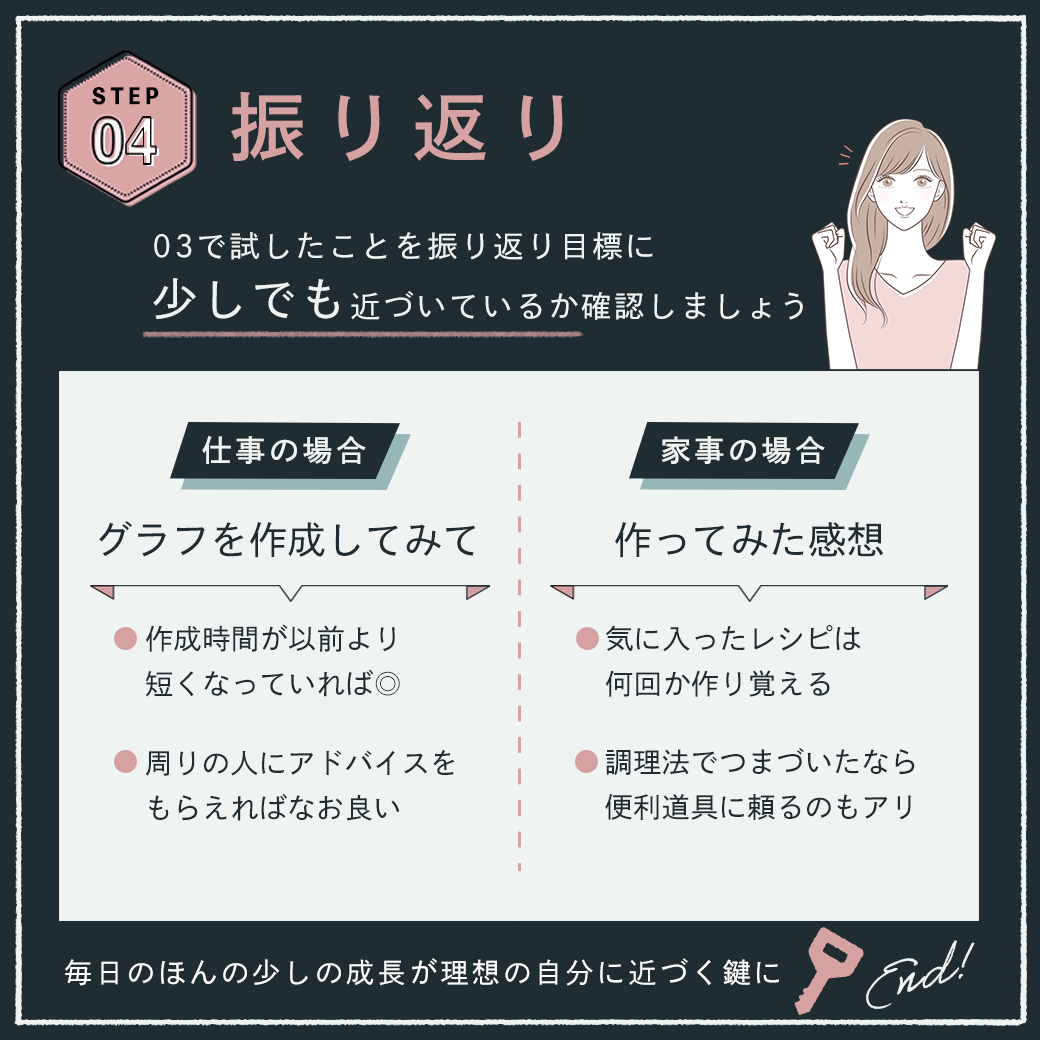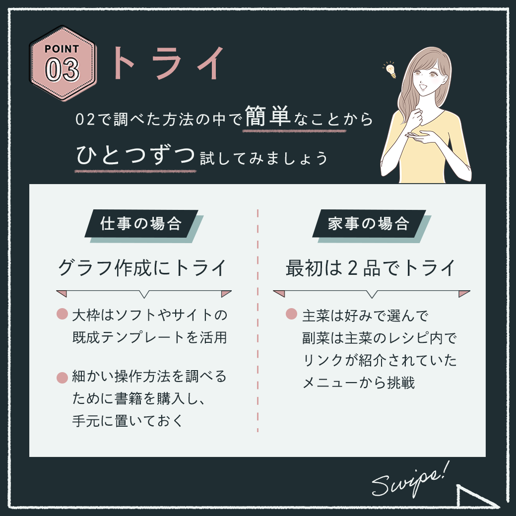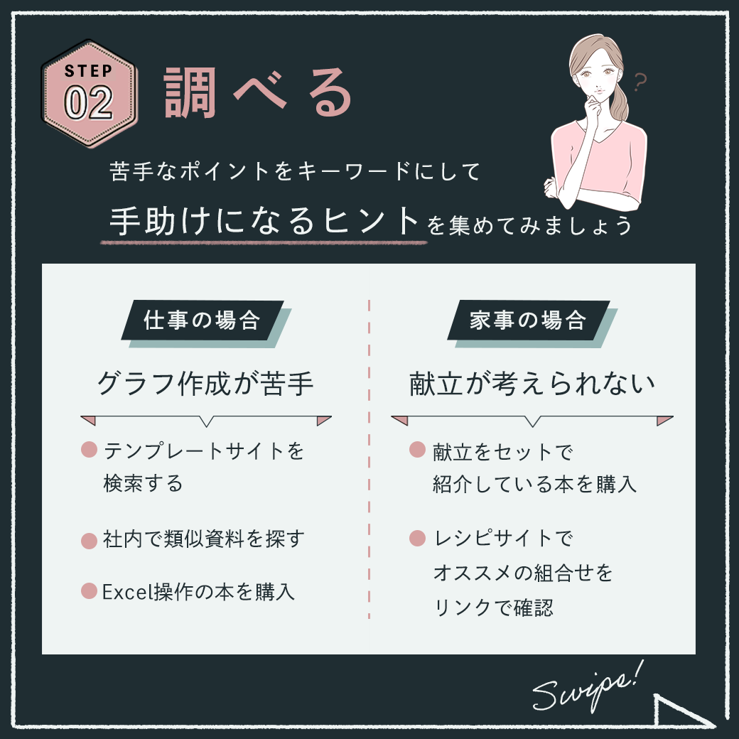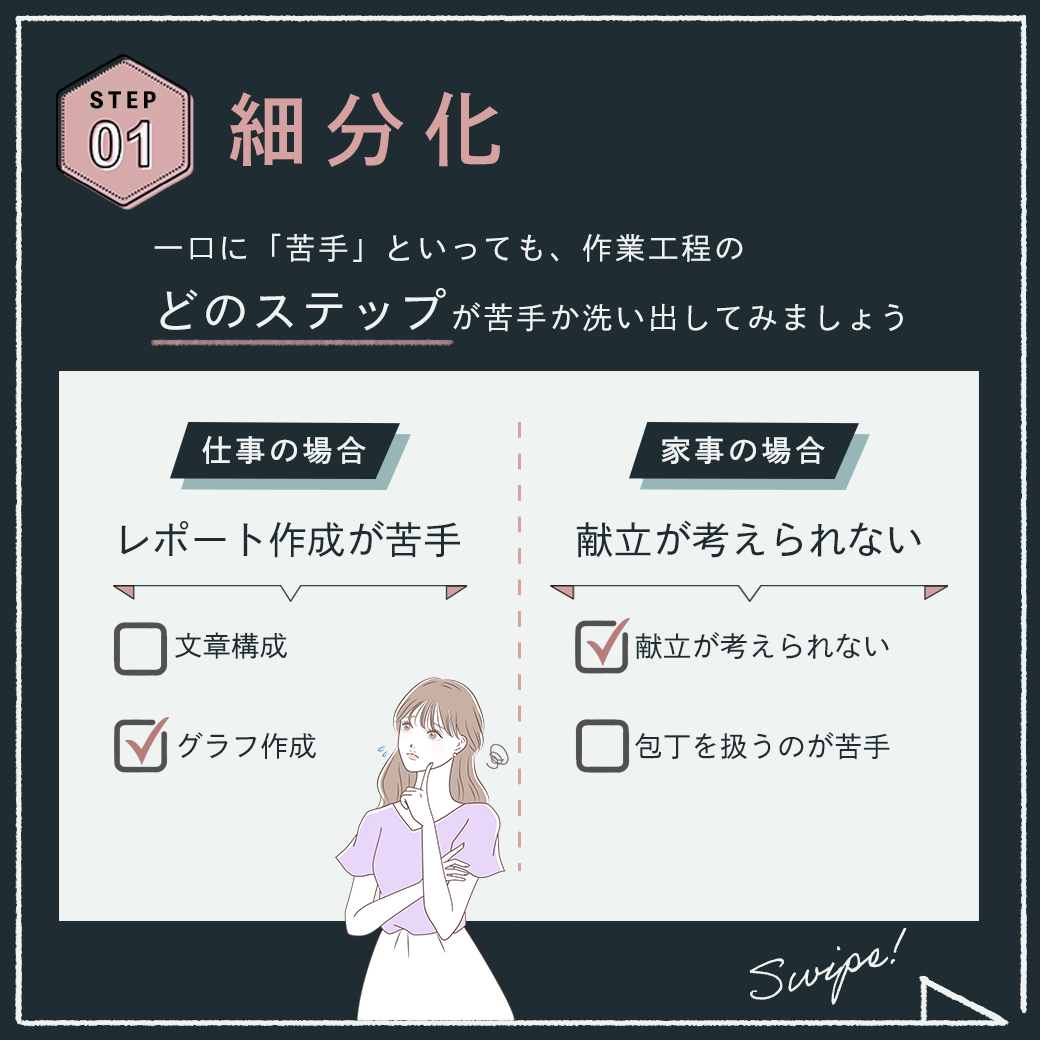 - ”仕事でもプライベートでも起こりうる”という点から、克服す方法の具体例を「仕事の場合」と「家事の場合」に分け各ページに記載。