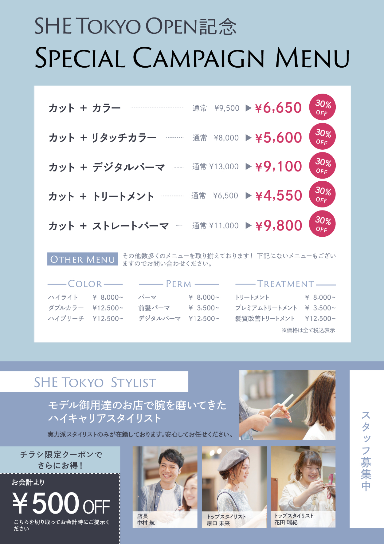 捨てられてしまう可能性が高いことを前提に、美容師の技術の高さを訴求しつつもキャンペーンメニューの情報、クーポン、スタッフ募集など何かしらに目を留め読んでもらえるように配置を工夫しました。