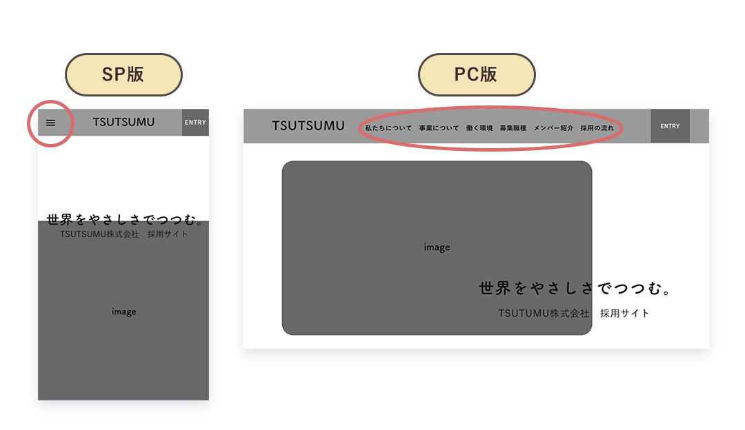 ヘッダーのメニューバーが表示できない為、ハンバーガーメニューに切替え表示を