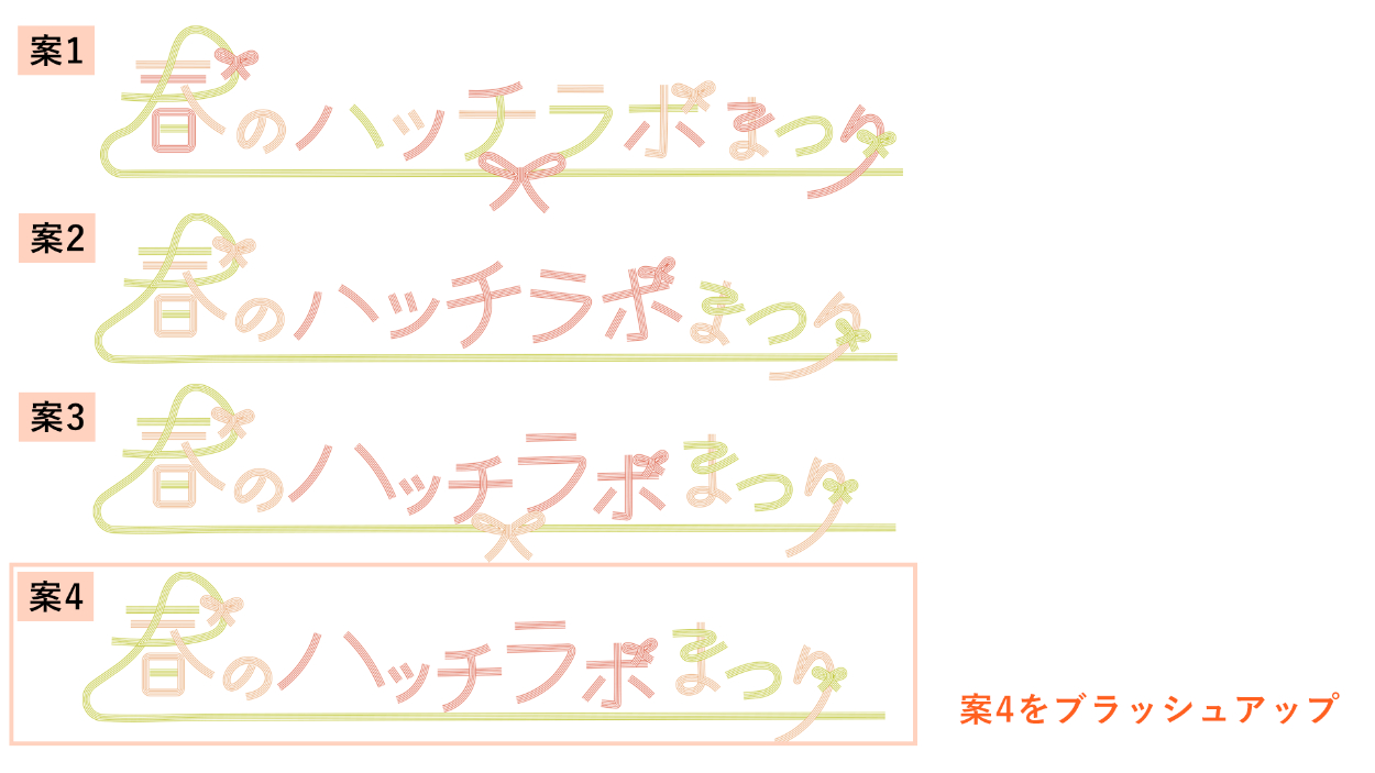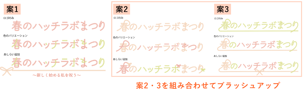 各案、単色・複数色・あしらい追加した場合で案出し。案2・3を組み合わせ、ブラッシュアップすることに。