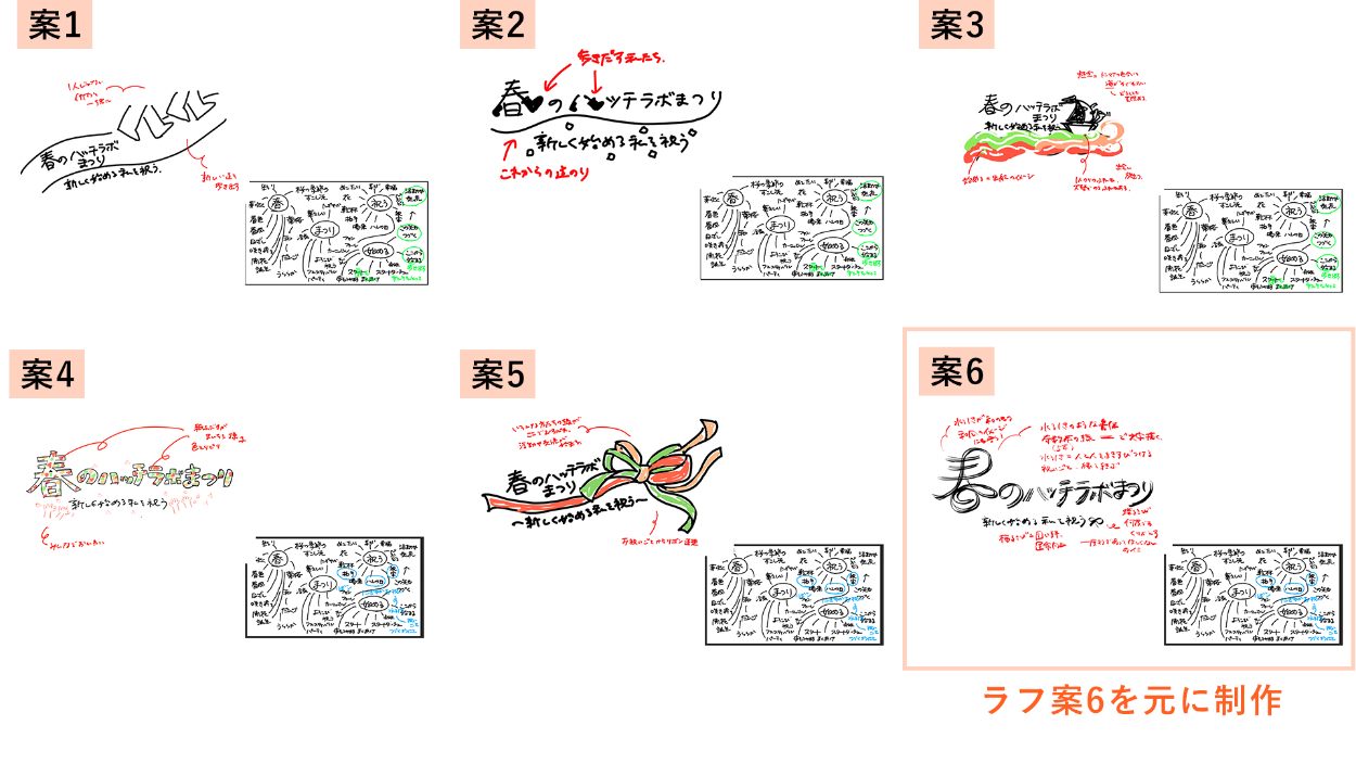 まずは言葉からイメージを膨らし、「まつり」や、イベントテーマである「祝う」をキーワードにラフ6案制作。クライアントとすり合わせた結果、「水引」をコンセプトにした案6を元に制作を進める。