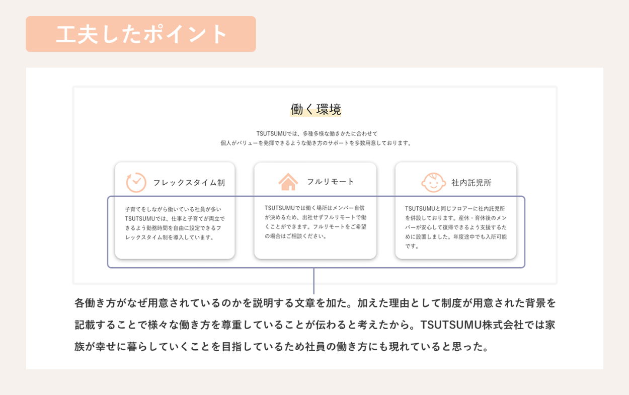 「働く環境」を紹介することで安心して働ける職場だと思う。
