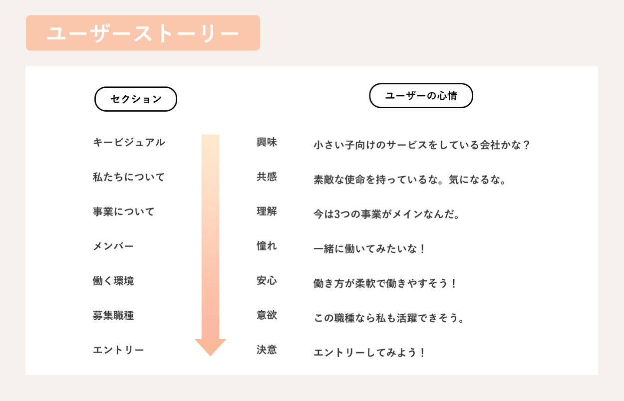 ・「私たちについて」で会社の思いを説明し、事業内容を見ることで理解と共感を生む。