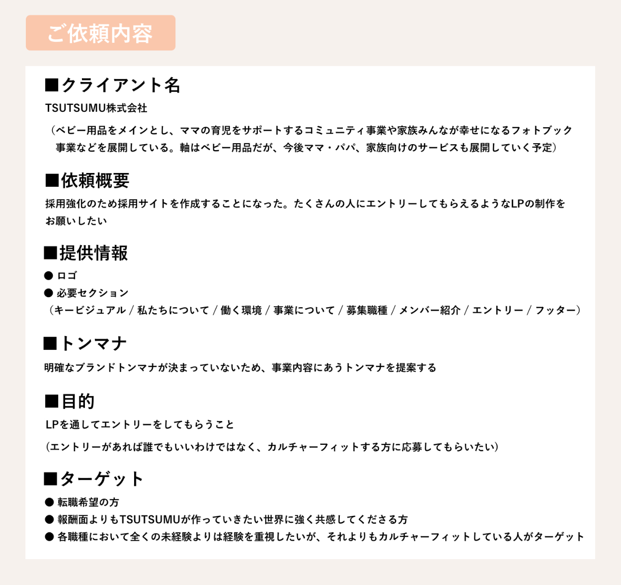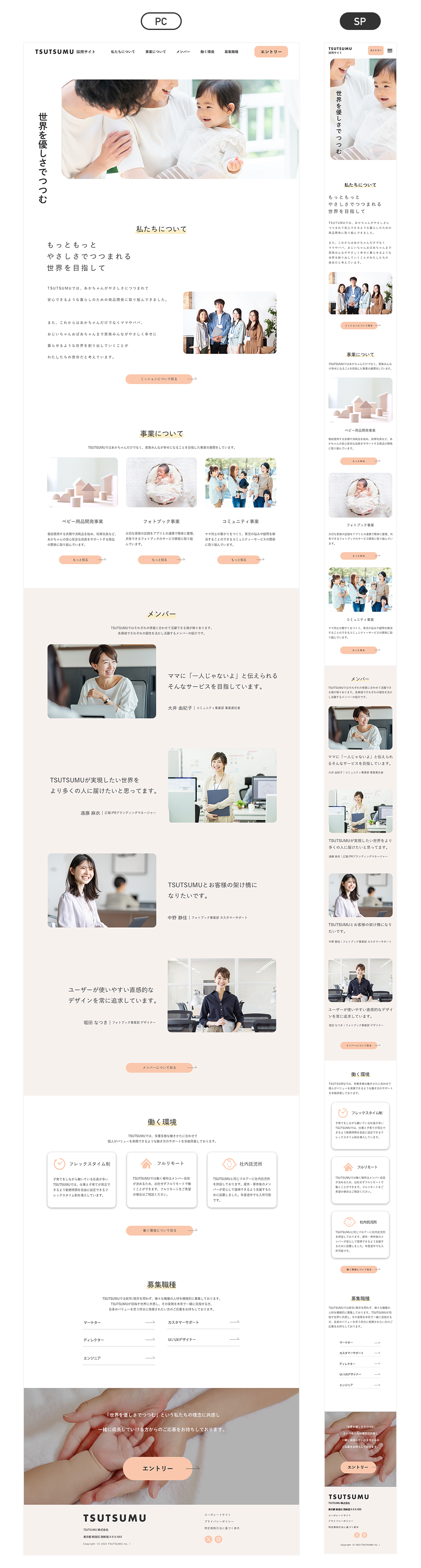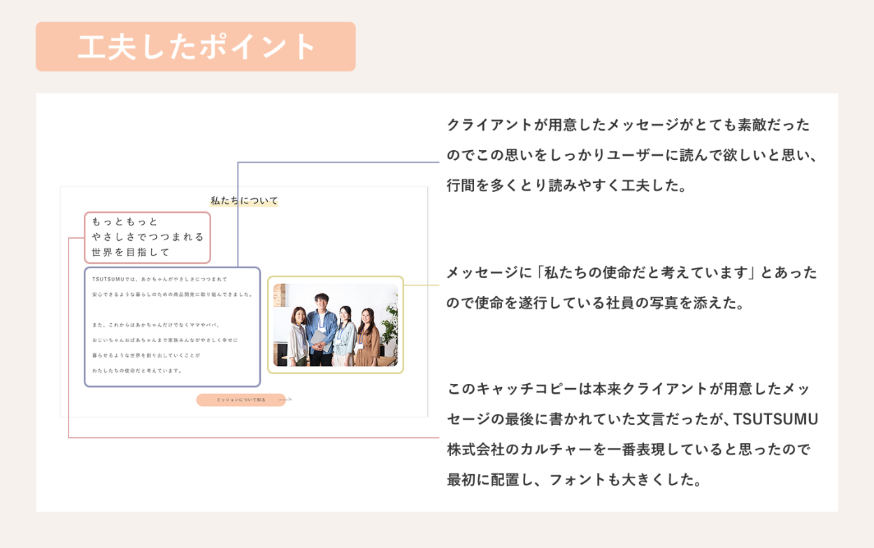・デザイン制作ではクライアントの世界観を伝えるため、「TSUTSUMU」から想像される柔らかさや温かさが伝わる配色を意識しました。