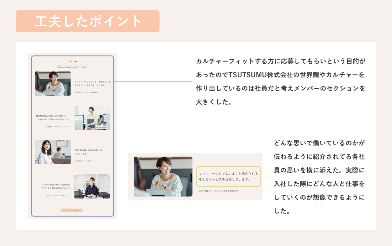 ・「メンバー」で社員の思いを見せユーザーがTSUTSUMUで働いている姿を想像でき、