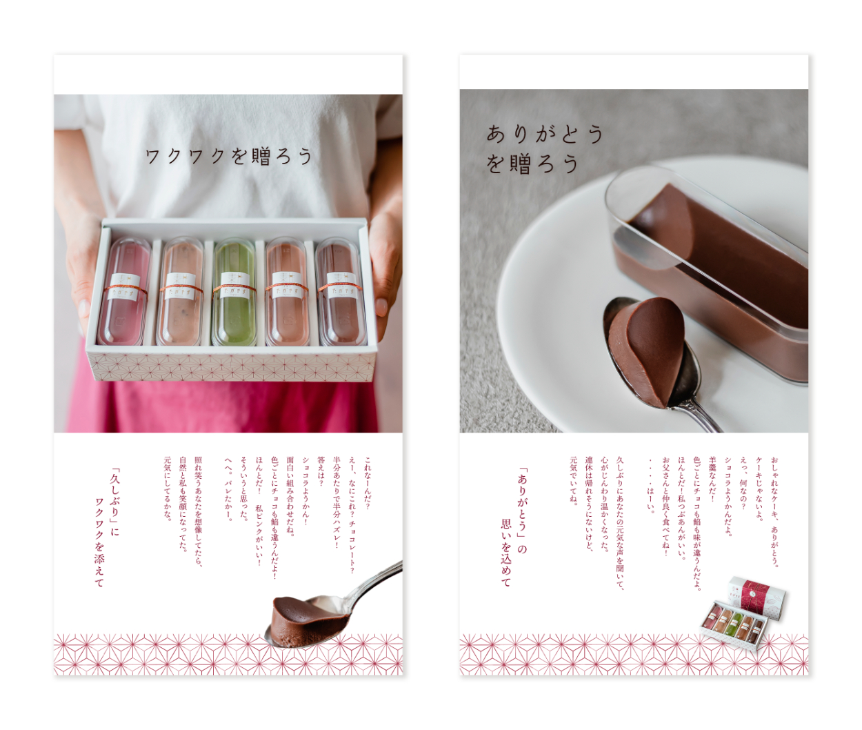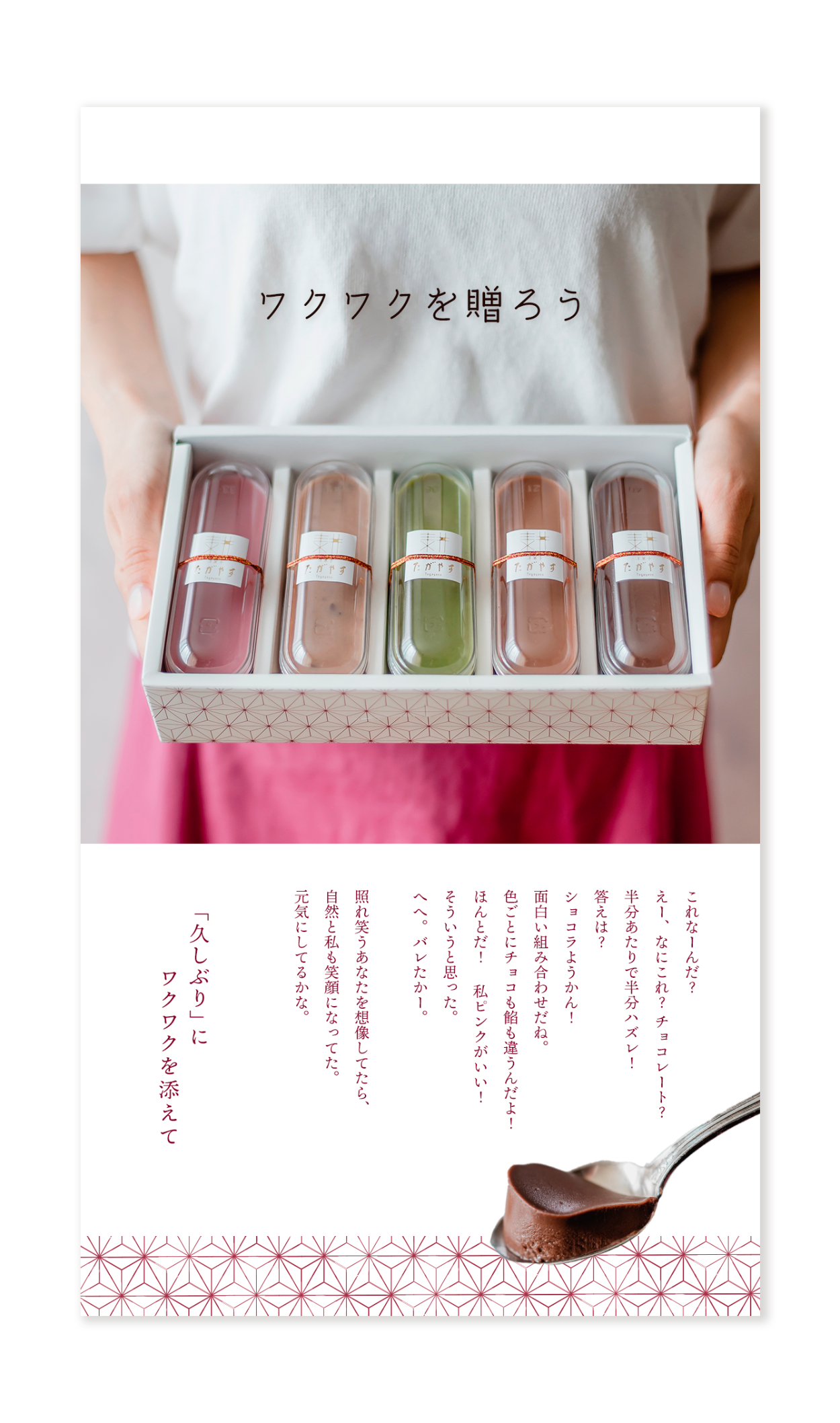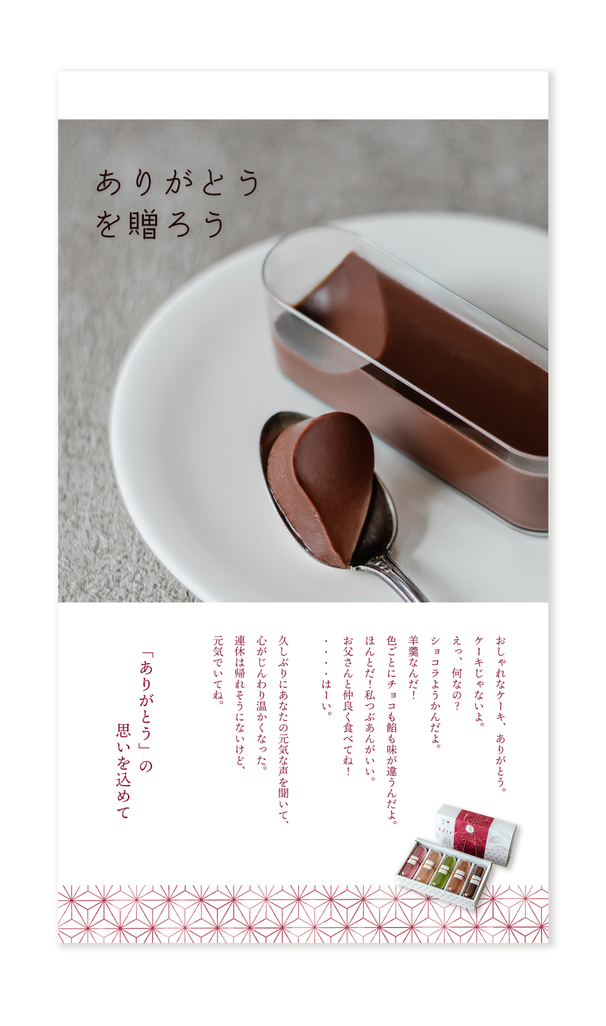 ボディコピーを読みたくなるようにするため、あえてシンプルに贈り物であることのみを表現した。また、「ショコラ+ようかん」という珍しい組み合わせだからこそ「ワクワク」の贈り物ができるということを暗に示そうと考えた。