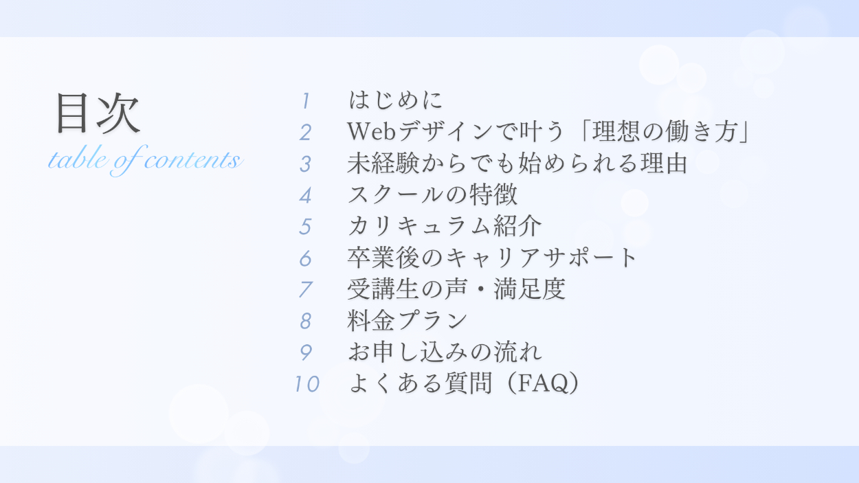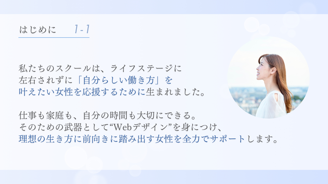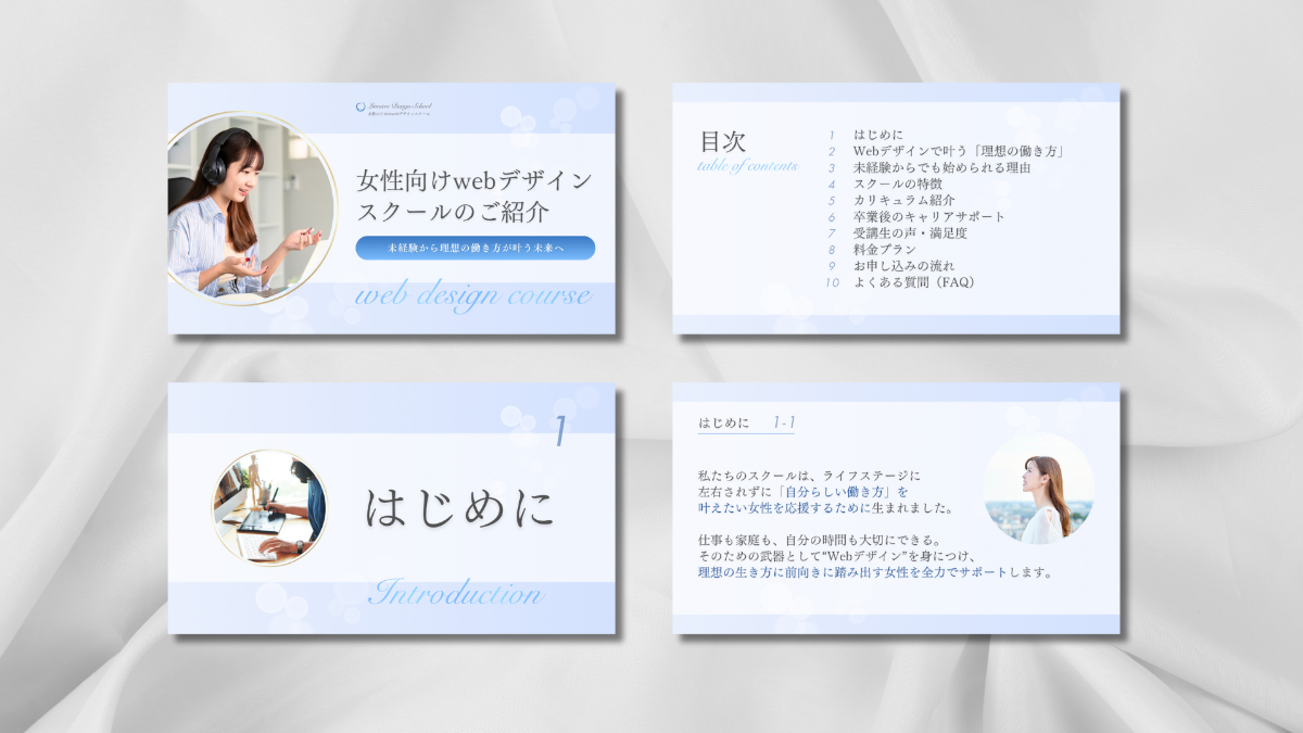 【自主制作】サービス資料作成:スクールの案内 riko webデザイナー OVERVIEW webデザインスクールを運営している企業の営業用資料(スクール案内資料)を作成しました。『未経験からwebデザインスキルの習得を支援するスクール』をテーマに、デザインを行いました。 ※自主制作※