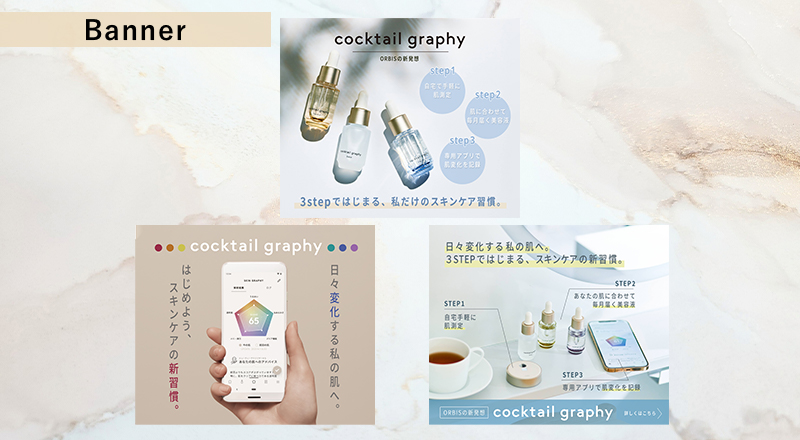 オルビス様から発売されている今のキレイと未来のキレイを引き出すパーソナライズスキンケアサービス「cocktail graphy(カクテルグラフィー)」の広告バナー制作コンペに参加しました。