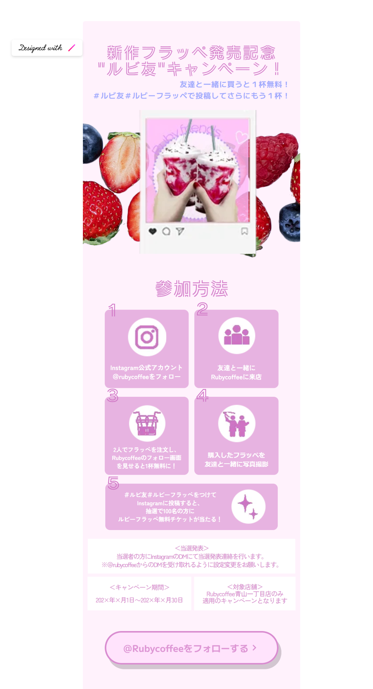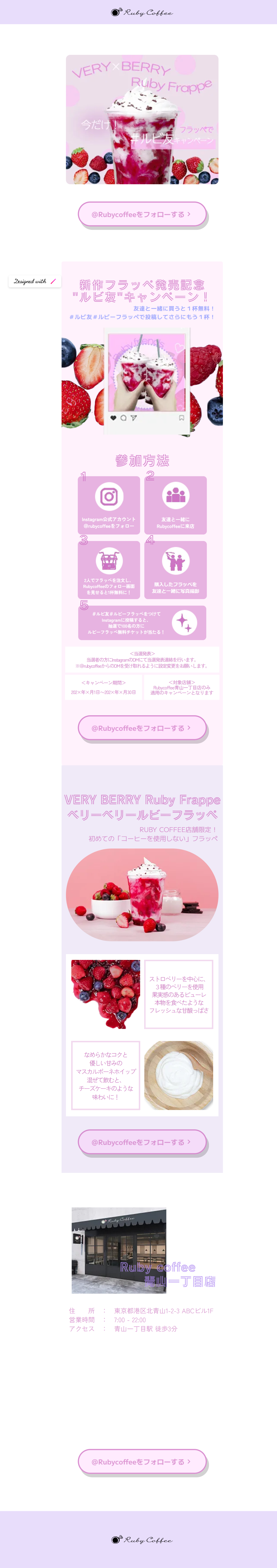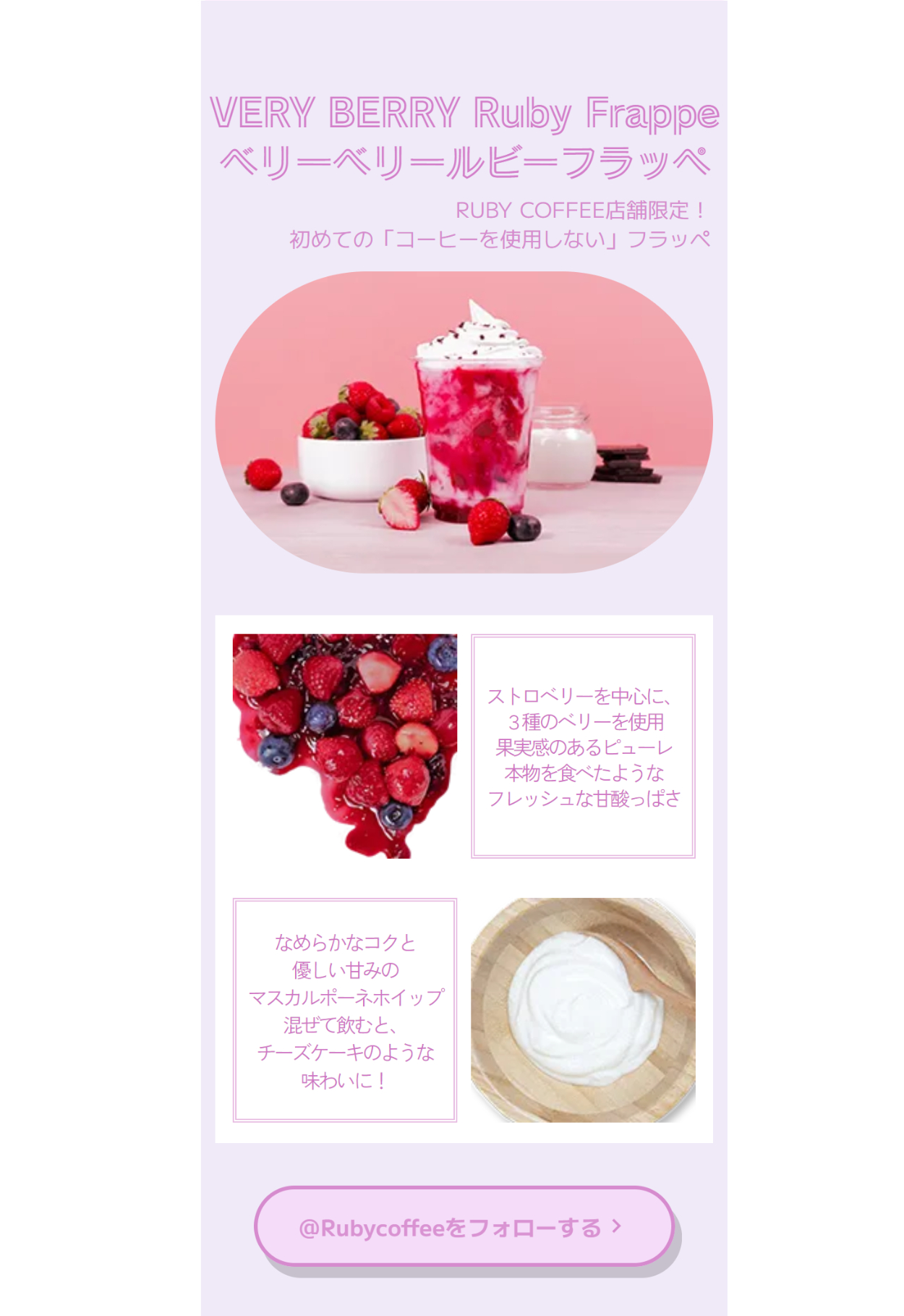 - 楽しくハッピーな雰囲気を出せるよう、「very berry Ruby Frappe」の文字カーブをつけて動きを出した。