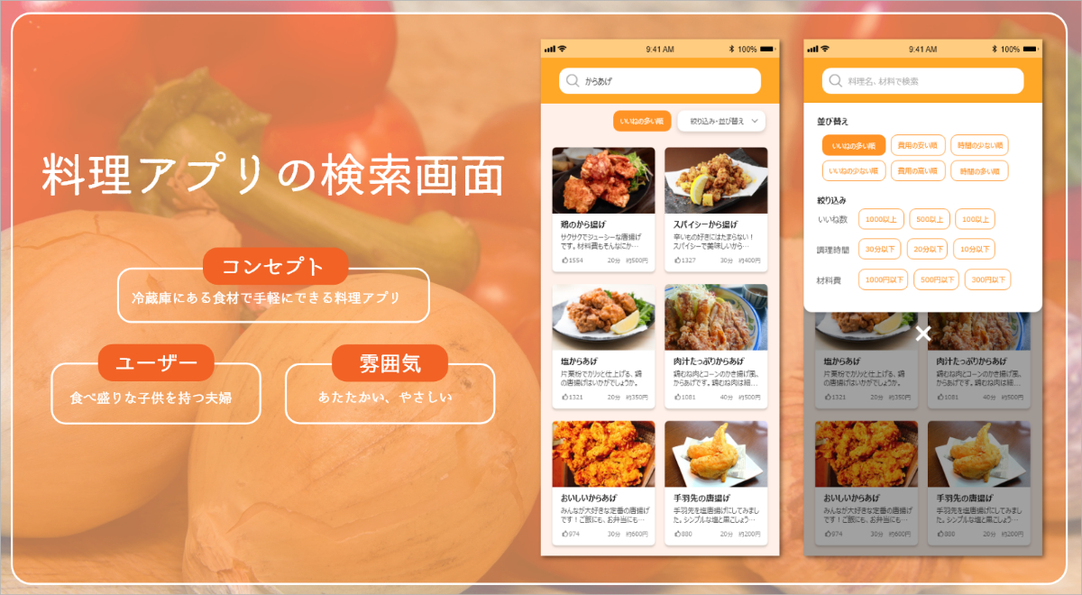 対象ユーザーの食べ盛りな子供を持つ夫婦はお金や時間が気になると思ったので、食費や作る時間で並べ替え・絞り込みを出来るようにしました。