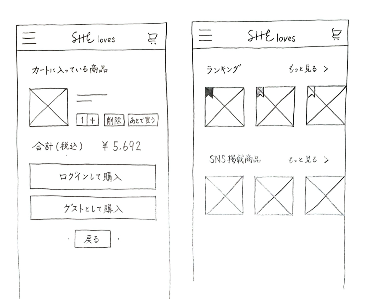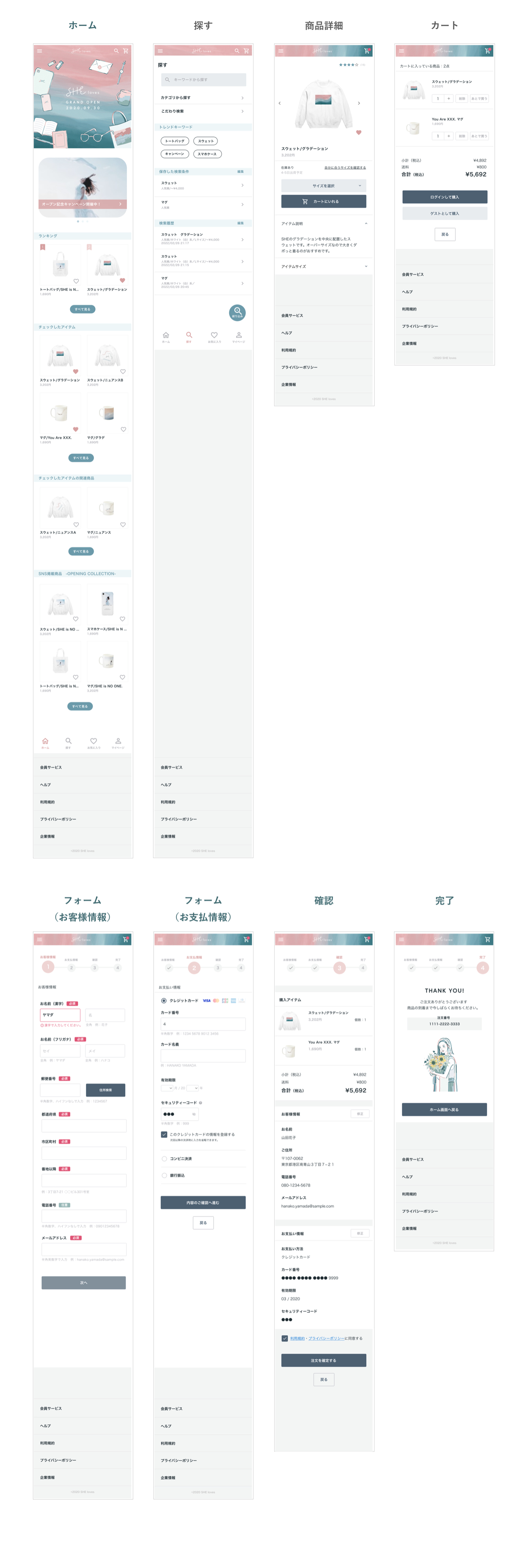既存のECサイトを比較し、使いやすいと感じたポイントを各サイトから取り入れました。フォームについては個別に調べ、離脱されない工夫を学んでから自分のデザインに反映させました。ボタンなどの要素を追加する際はSHEのデザインガイドラインに沿って作成し、トンマナの統一性を重視しました。