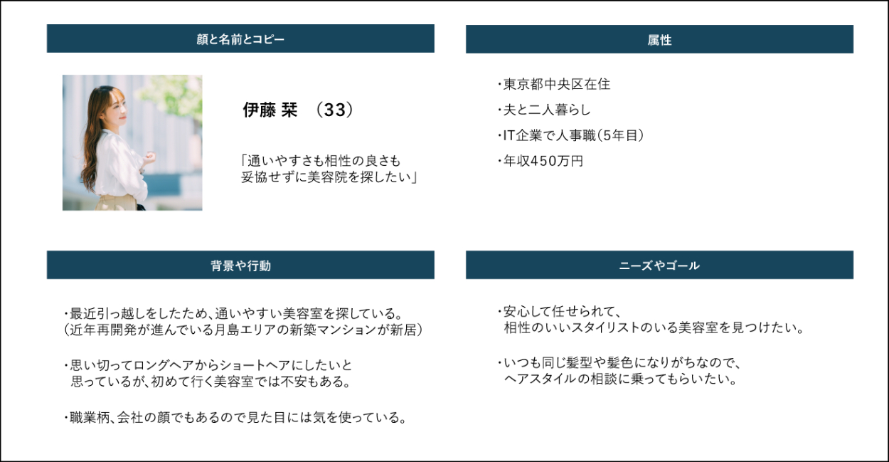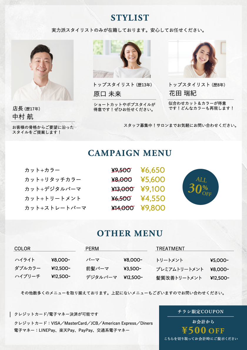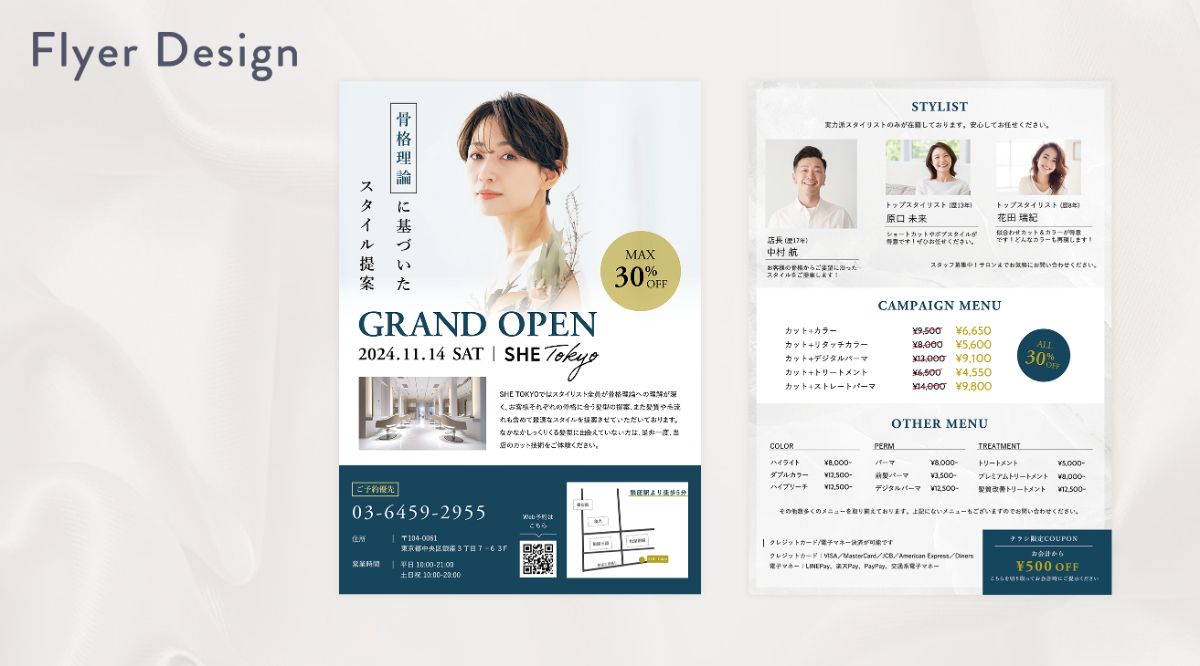 - 「骨格から似合うスタイルを提案する」ということを強みにしている美容室なので、表面には骨格が分かりやすいショートカットの女性の画像、横にはコピーを配置しまず目に入るような情報設計にしました。