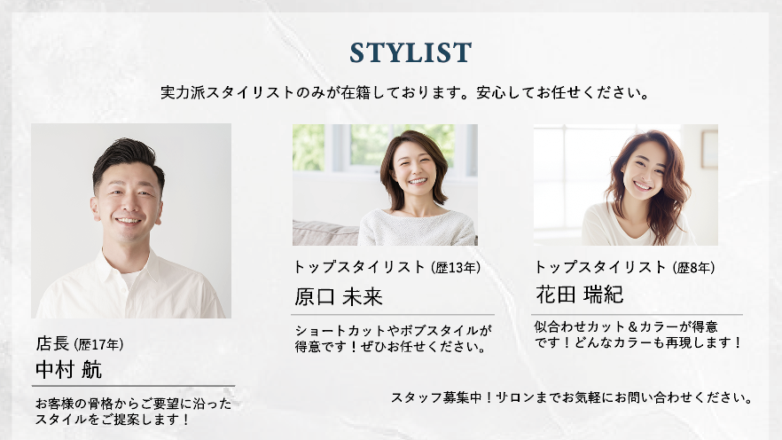 - 歴○年と表記することでスタイリストの経験が豊富であること、各スタイリストの得意な施術も記載することで安心感を与えて予約に進めるようにしました。