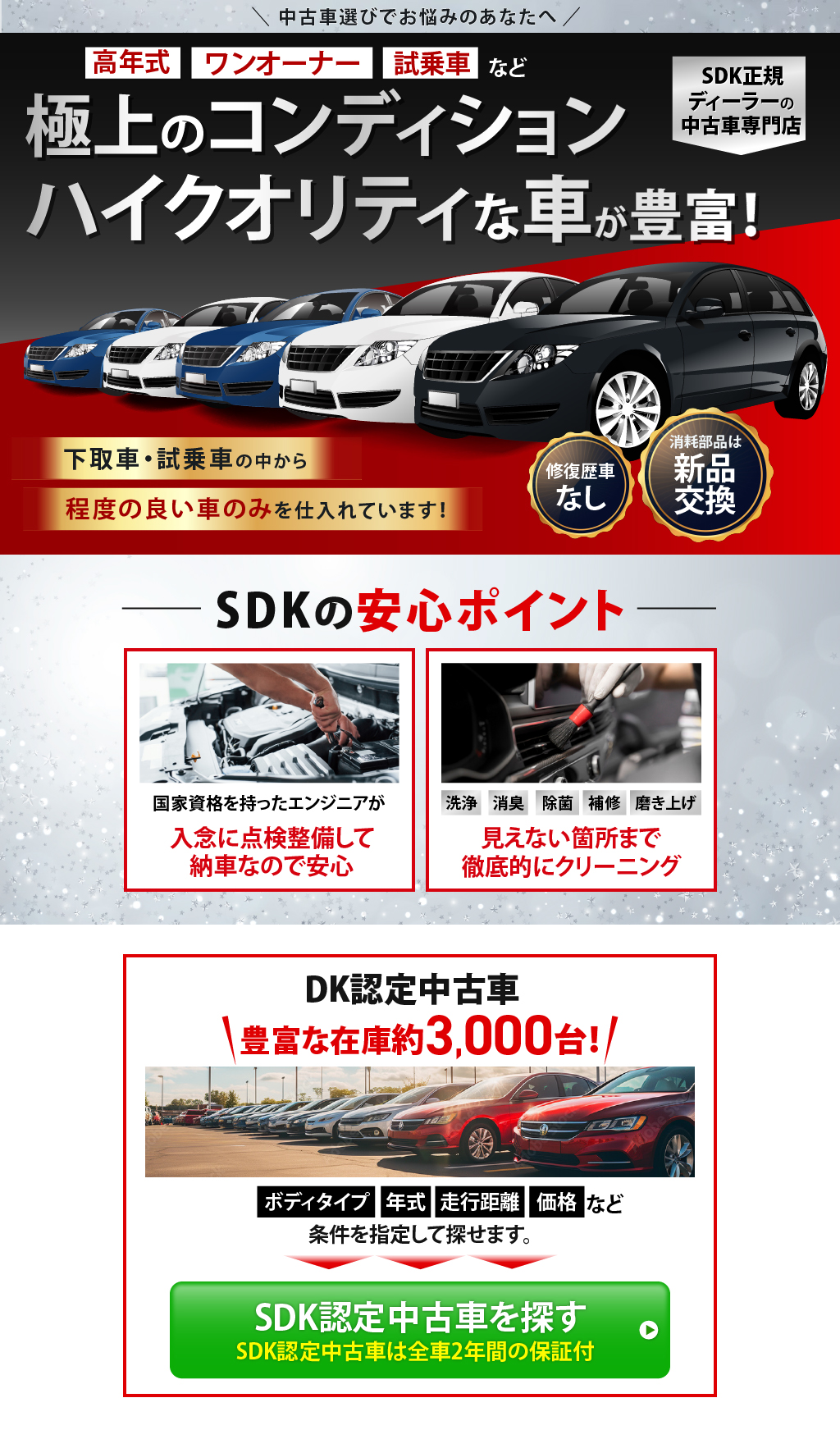 正規ディーラー中古車販売のランディングページデザインを作成しました。