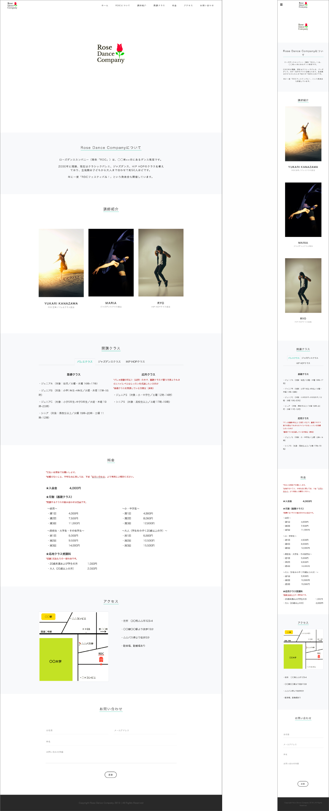 架空のダンススクール「Rose Dance Company(ローズダンスカンパニー)」のLPサイト制作を実施。デザイン、構成・ライティング、コーディング、サイトのアップロード等の作業を行なった。使用言語やツールは、HTML5&CSS3/jQuery/Bootstrapなど。