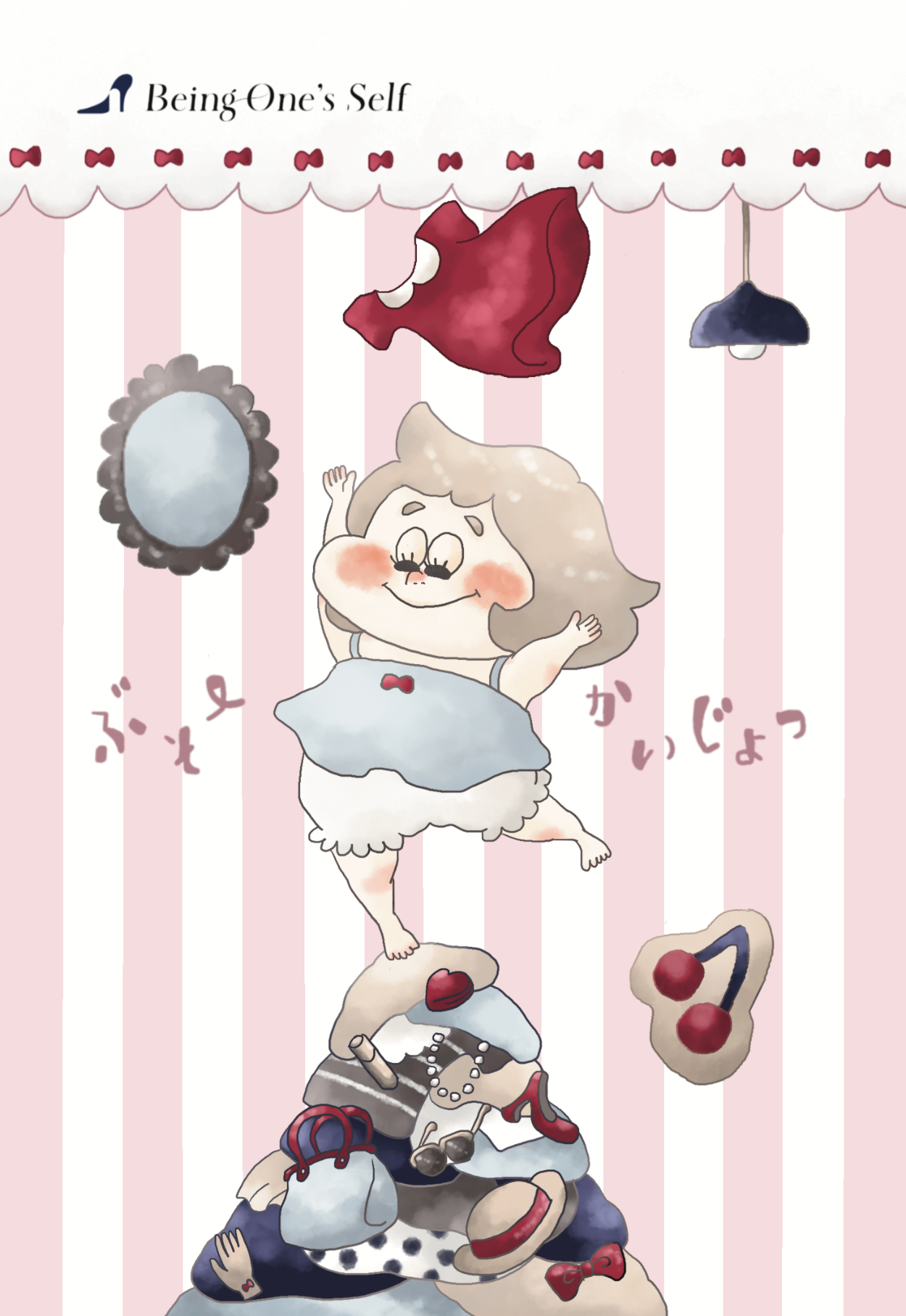 ・たくさんの化粧品やお洋服、バッグに囲まれていても、自分自身の笑顔が一番のアクセサリー・・・そんなメッセージが伝わるように描いてほしい。