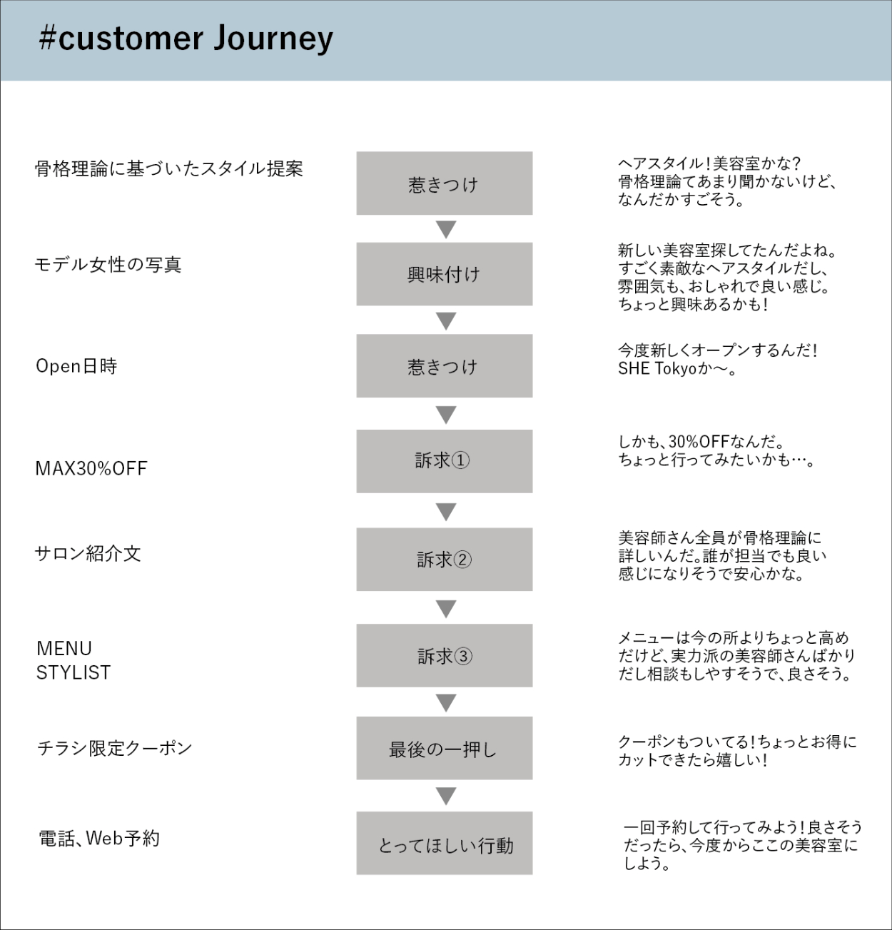 ①サロンのアピールポイントとして「骨格理論に基づいたスタイル提案」を前面に押し出しているため、キャッチコピーで興味を惹くよう、Z型の視線誘導の視点である左上に配置。