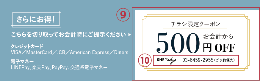 ⑩切り離して保管する場合も考慮し、クーポン内にもサロン名と連絡先を入れた。