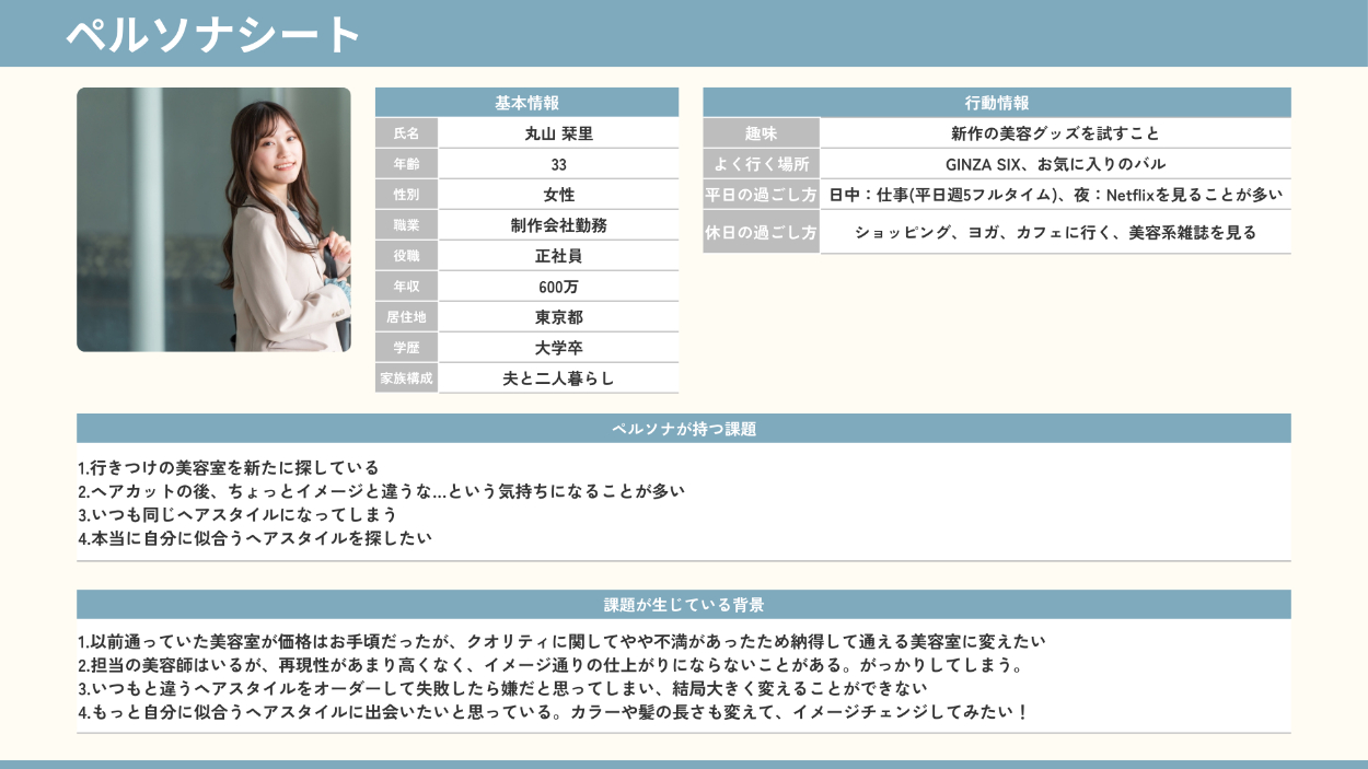 ②キャッチコピーの「骨格理論」の裏付けができるよう、骨格とヘアスタイルの両方がより伝わりやすいヘアスタイルのイメージ写真を起用。
