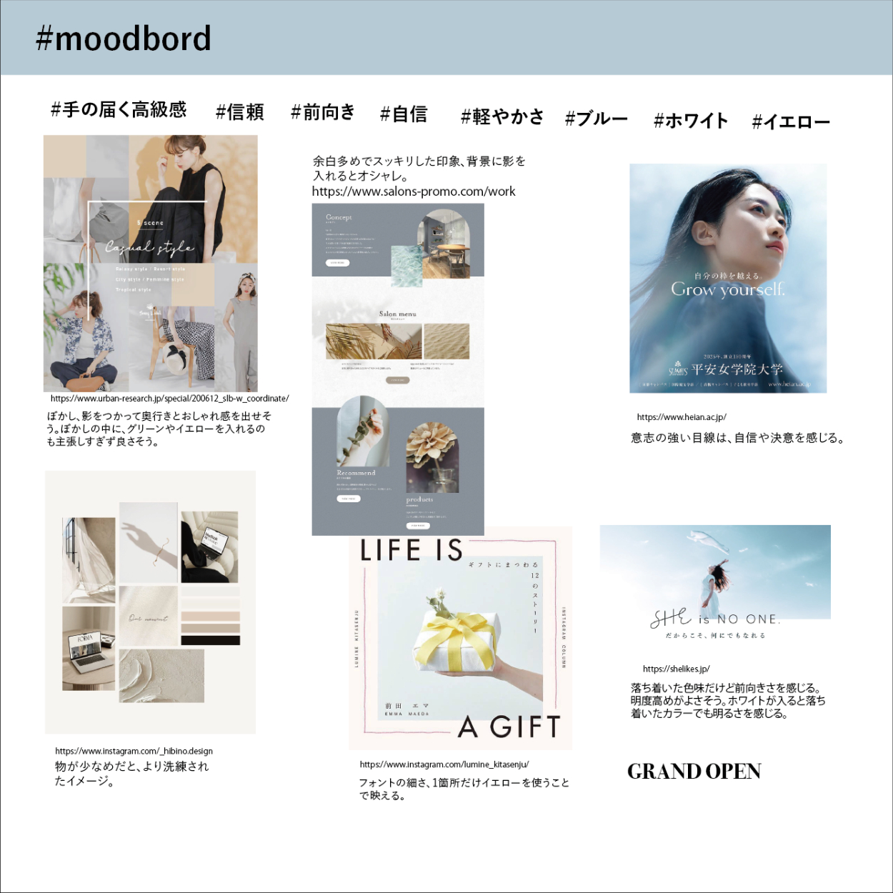また、高級過ぎて敷居の高さを感じさせることなく幅広い世代のお客様に来店いただけるよう、明度を落としたブルーをメインカラーに使うことで「落ち着き・手の届く高級感」を表現した。