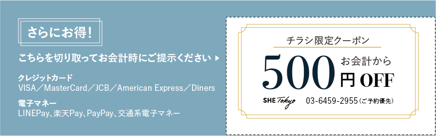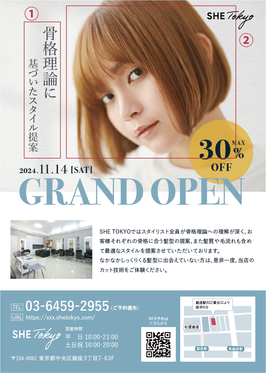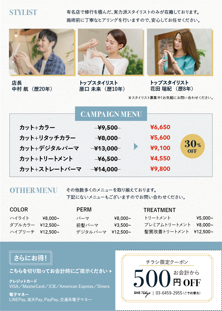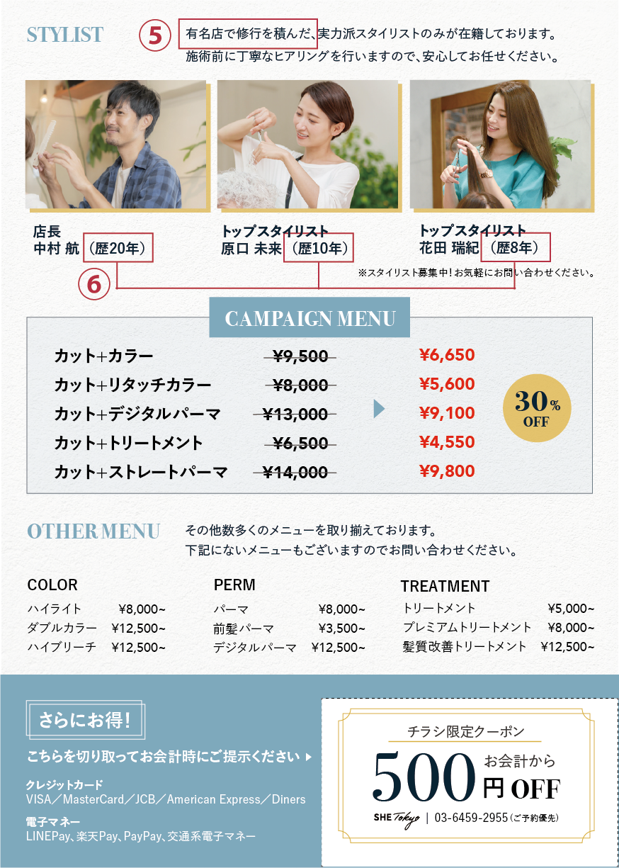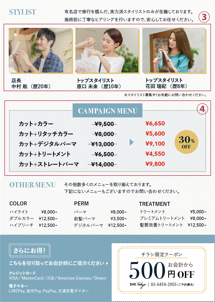 SHElikes PROデザイナーの課題で、架空のヘアサロンSHE Tokyo様のキャンペーンチラシの作成。ヒアリング〜入稿までの一連の流れを実践しました。【制作時期:2025.8/制作期間:2週間/制作時間:50時間/使用ツール:Illustrator、Photoshop】