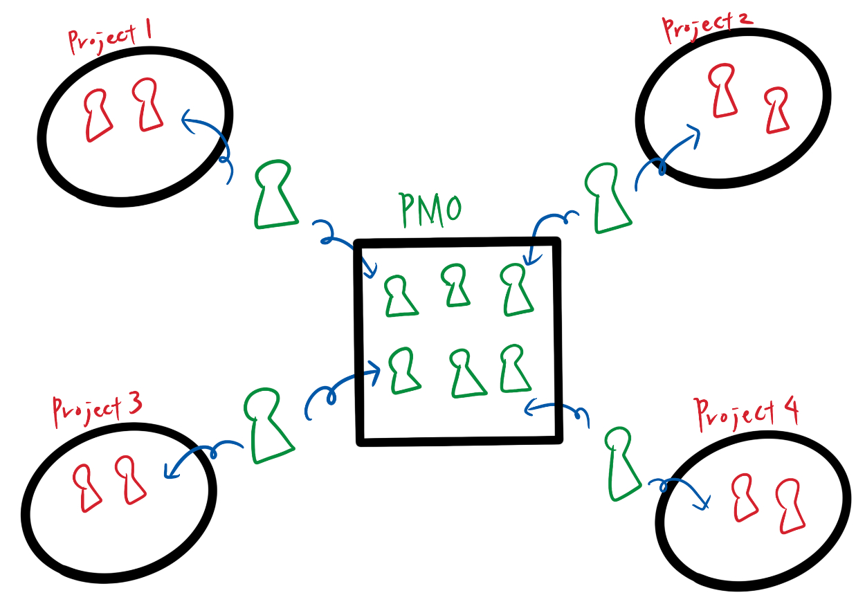 プロジェクトをマネジメント観点でケアする制度としてPMO体制を構築したいわけですから、プロジェクトマネジメント経験が豊富なメンバーを選出するのが理想ですが、当初はまだまだ若い会社だったのでそれに該当するメンバーがあまりいませんでした。その不足している箇所を1のチェックリストと毎週1時間 ~ 1時間半のPMO MTGでプロジェクトヘルスチェックの質を担保するよう考えました。体制は以下です。