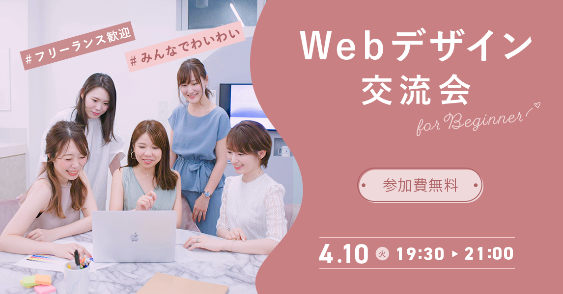 女性のWebデザイナーが楽しく同業者と交流ができている雰囲気の写真を選びました。写真にもピンク加工することで写真だけ浮くことがなく、全体的に暖かい柔らかい雰囲気に仕上げました。都内ベンチャー企業に勤務している美容、ファッションにも意識が高い20-30代女性をペルソナとし、くすみピンク系のカラーで統一し、おしゃれで抜け感のあるデザインにしました。