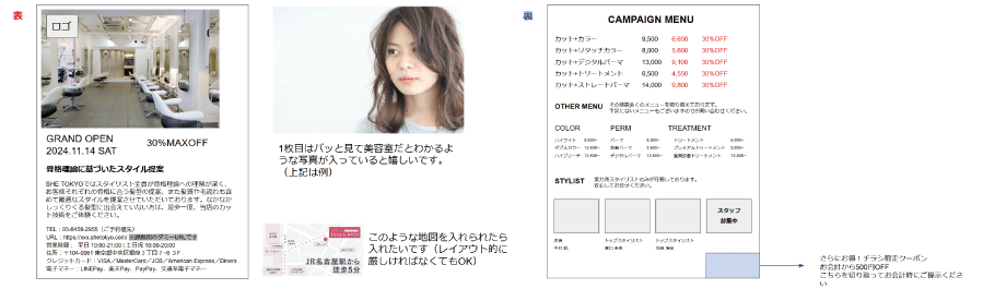 また、表面では、ユーザーを引き付ける要素が大きく配置されており、裏面で内容の詳細を記載しているチラシが多かった。