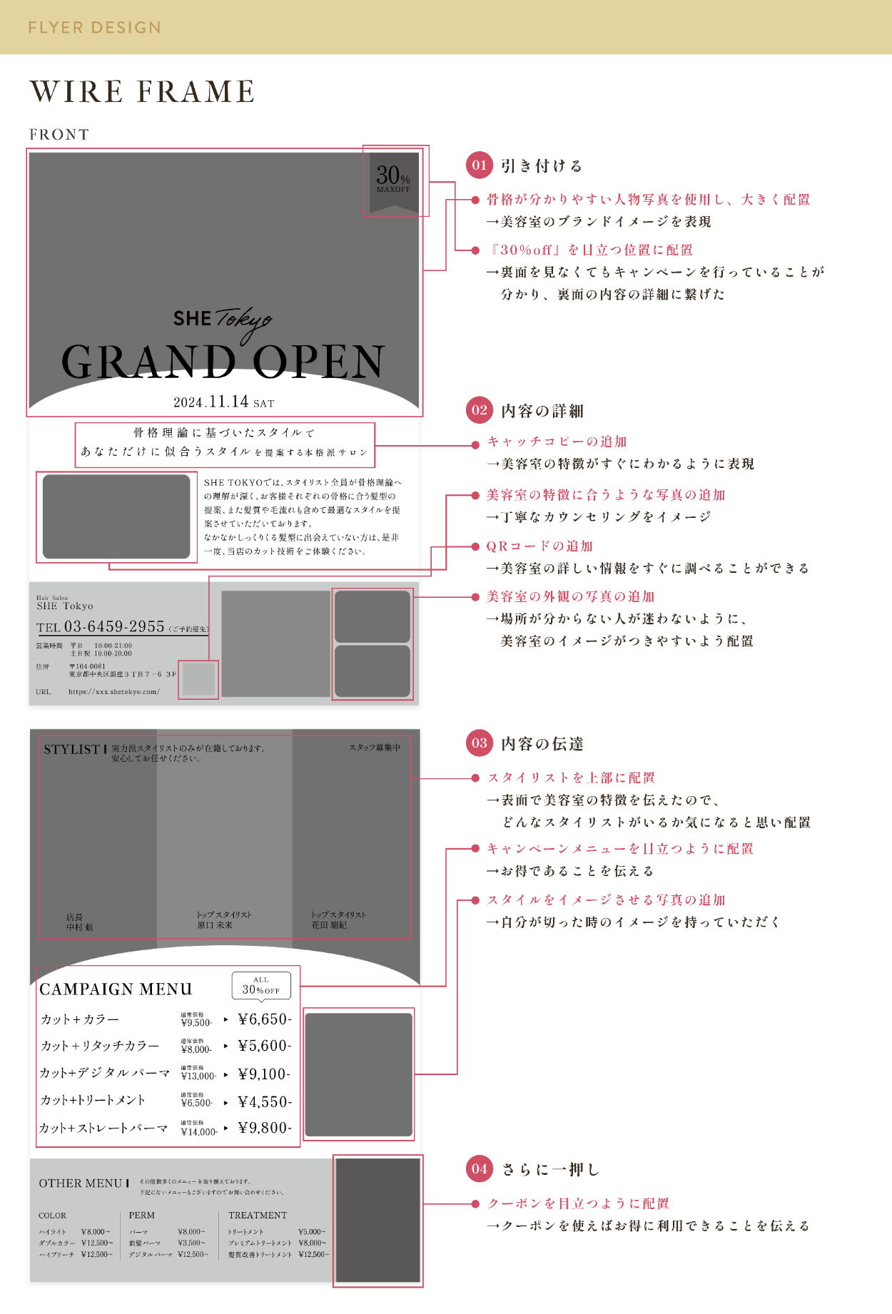 SHElikes MULTI CREATOR PROJECTにて、フライヤー制作に取り組みました。クライアントから頂いたワイヤーフレームをもとに、印刷物のデザインを行いました。